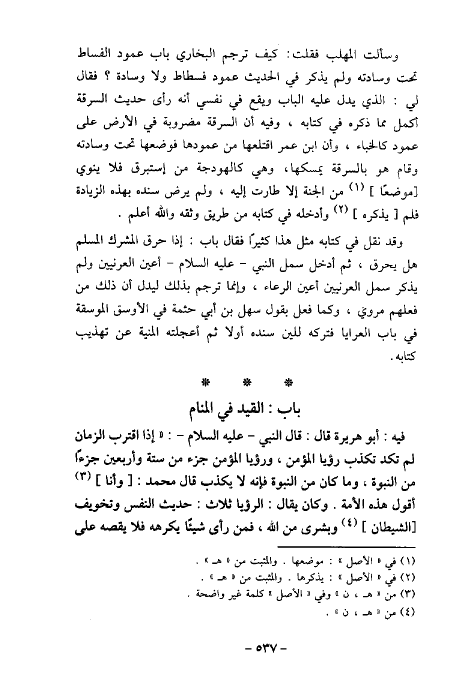 وسألت المهلب فقلت: كيف ترجم البخارى باب عمود الفساط تحت وسادته ولم يذكر فى الحديث عمود فسطاط ولاوسادة؟ فقال لى: الذى يدل عليه الباب ويقه فى نفسى أنه رأى حديث السرقة أكمل مما ذكره فى كتابه، وفيه أن السرقة مضروبة فى الأرض على عمود كالخباء، وأن ابن عمر اقتلعها من عمودها فوضعها تحت وسادته وقام هو بالسرقة يمسكها، وهى كالهودجة من إستبرق فلا ينوى موضعًا من الجنة إلا طارت إليه، ولم يرض سنده بهذه الزيادة فلم يذكره وأدخله فى كتاب من طريق وثقة والله أعلم. وقد نقل فى كتابه مثل هذا كثيرًا فقال باب: إذا حرق المشرك المسلم هل يحرق، ثم أدخل سمل النبى عليه السلام أعين العرنين ولم يذكر سمل العرنين أعين الرعاء، وإنما ترجم بذلك ليدل أن ذلك من فعلهم مروى، وكما فعل بقول سهل بن أبى حثمة فى الأوسق الموسقة فى باب العرايا فتركه للين سنده أولا ثم أعجلته المنية عن تهذيب كتابه.