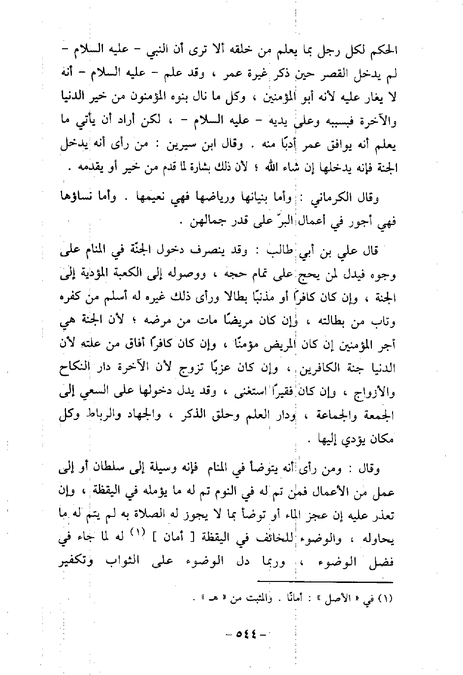 الحكم لكل رجل بما يعلم من خلقه ألاترى أن النبى - عليه السلام - لم يدخل القصر حين ذكر غيره عمر، وقد علم عليه السلام أنه لايغار عليه لأنه أبو المؤمنين، وكل مانال بنوه المؤمنين من خير الدنيا والآخرة فسببه وعلى يديه (صلى الله عليه وسلم) ، لكن أراد أن يأتى ما يعلم أنه يوافق عمر أدبا منه. وقال ابن سيرين: من رأى أنه يدخل الجنة فإنه يدخلها إن شاء الله؛ لأن ذلك بشارة لما قدم من خير أو يقدمه. وقال الكرمانى: وأما بنيانها فهى نعيمها. وأما نساؤها فهى أجور فى أعمال البر على قدر جمالهن. قال على بن أبى طالب: وقد ينصرف دخول الجنة فى المنام على وجوه فيدل لمن يحج على تمام حجه، ووصوله إلى الكعبة المؤدية إلى الجنة، وإن كان كافرًا أو مذنبًا بطالا ورأى ذلك غيره له أسلم من كفره وتاب من بطالته، وإن كان مريضا مات من مرضه؛ لأن الجنة هى أجر المؤمنين إن كان المريض مؤمنًا، وإن كان كافرًا أفاق من علته لأن الدنيا جنة الكافرين، وإن كان عزبًا تزوج لأن الآخرة على السعى إلى الجمعة والجماعة، ودار العلم وحلق الذكر، والجهاد والرباط وكل مكان يؤدى إليها. وقال: ومن رأى أنه يتوضًا فى المنام فإنه وسيلة السلطان أو إلى عمل من الأعمال فمن تم له فى النوم تم له مايؤمله فى اليقظة، وإن تعذر عليه إن عجز الماء أو توضأ بما لايجوز له الصلاة به لم يتم له ما يحاوله، والوضوء للخائف فى اليقظة أمان له لما جاء فى فضل الوضوء، وربما دل الوضوء على الثواب وتكفير