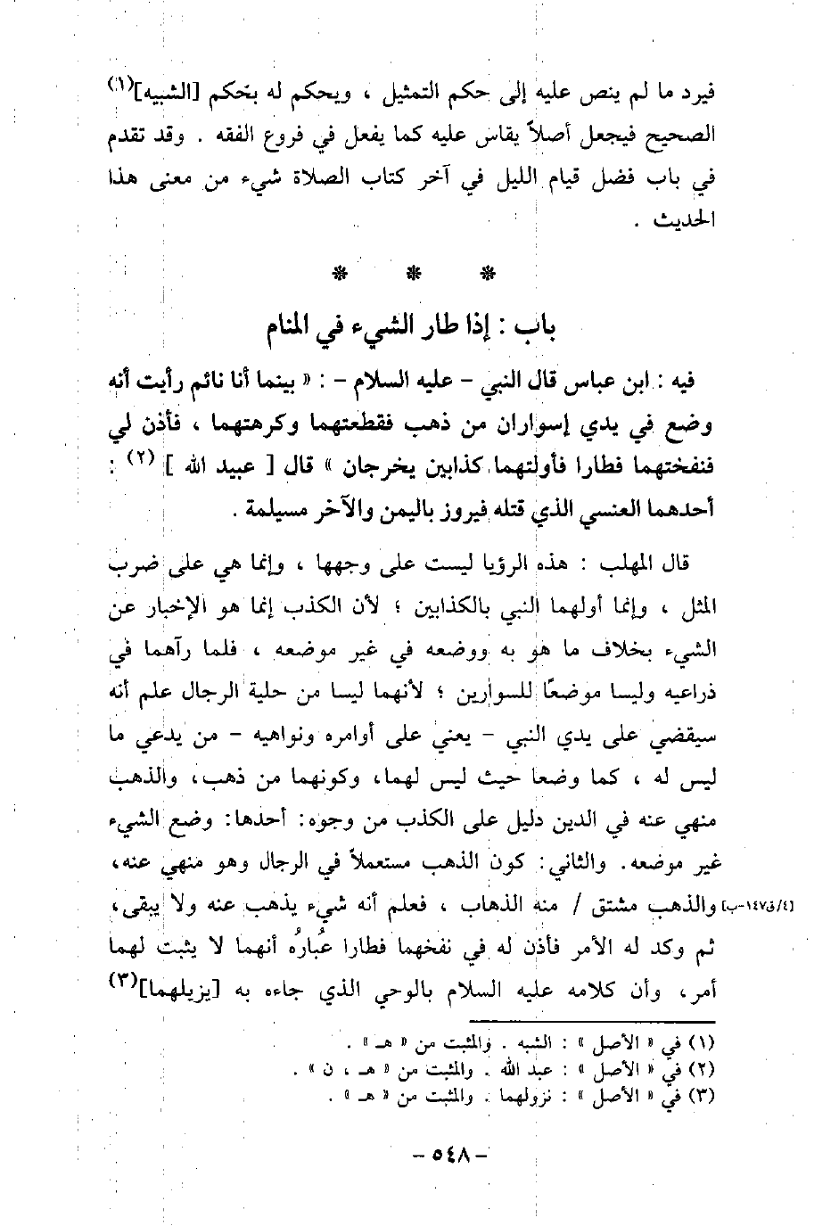 / 28 - فيه: ابْن عَبَّاس، قَالَ النَّبِىّ (صلى الله عليه وسلم) : (بَيْنَا أَنَا نَائِمٌ، رَأَيْتُ أَنَّهُ وُضِعَ فِى يَدَىَّ سِوَارَانِ مِنْ ذَهَبٍ، فَقِطَعْتُهُمَا وَكَرِهْتُهُمَا، فَأُذِنَ لِى فَنَفَخْتُهُمَا فَطَارَا، فَأَوَّلْتُهُمَا: كَذَّابَيْنِ يَخْرُجَانِ) . قَالَ عُبَيْدُاللَّهِ: أَحَدُهُمَا الْعَنْسِى الَّذِى قَتَلَهُ فَيْرُوزٌ بِالْيَمَنِ، وَالآخَرُ مُسَيْلِمَةُ. قال المهلب: هذه الرؤيا ليست على وجهها، وإنما هى على ضرب المثل، وإنما أولهما النبى بالكذابين؛ لأن الكذب إنما هو الإخبارعن الشىء بخلاف ما هو به ووضعه فى غير موضوعه، فلما رآهما فى ذراعيه وليسا موضعًا للسوارين؛ لأنهما ليسا من حلية الرجال علم أنه سيقضى على يدى النبى - يعنى على أوامره ونواهيه - من يدعى ما ليس له، كما وضعا حيث ليس لهما، وكونهما من ذهب، والذهب منهى عنه فى الدين دليل على الكذب من وجوه: أحدها: وضع الشىء غير موضوعه. والثانى: كون الذهب مستعملاً فى الرجال وهو منهى عنه والذهب مشتق منه الذهاب، فعلم أنه شيء يذهب عنه ولايبقى، ثم وكد له الأمر فأذن له فى نفخهما فطارًا عباره أنهما لايثبت لهما أمر، وأن كلامه عليه السلام بالوحي الذى جاءه به يزيلهما