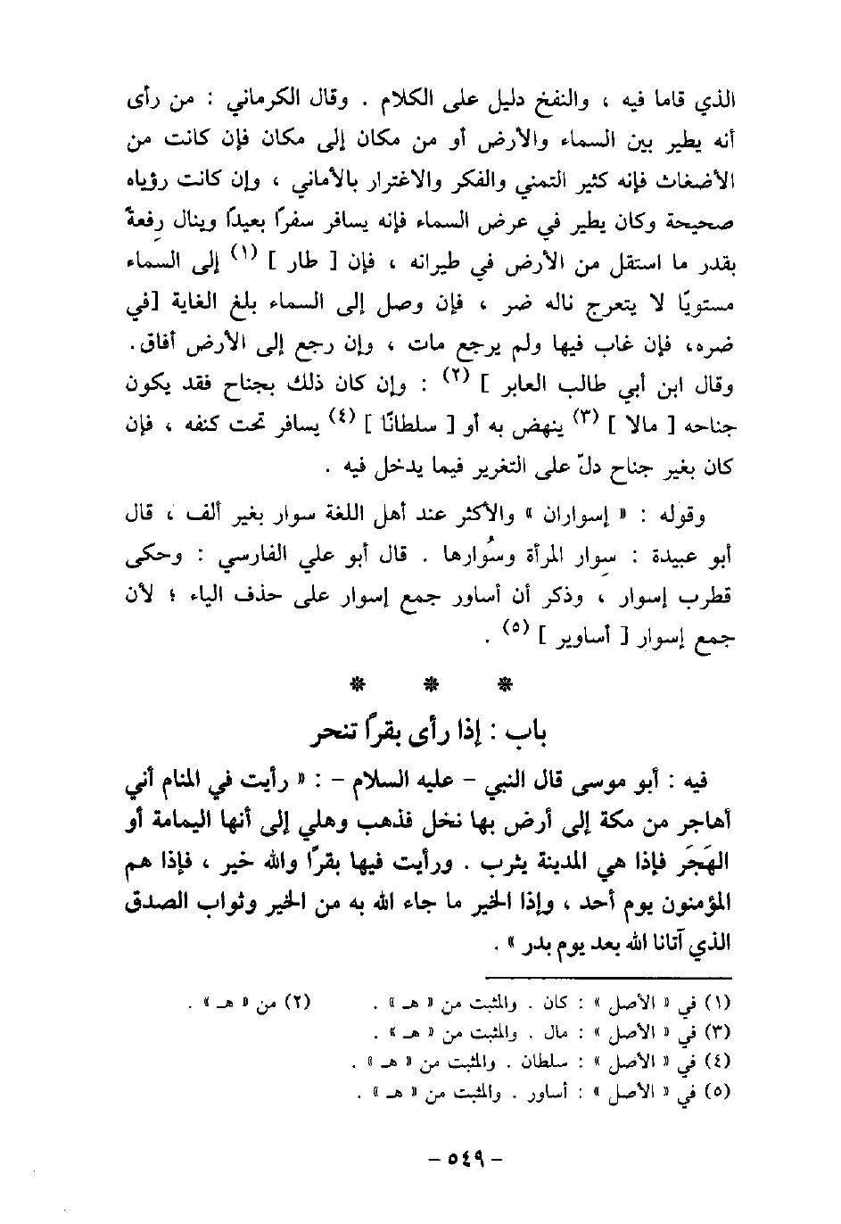 الذي قاما فيه، والنفخ دليل على الكلام. وقال الكرمانى: من رأى أنه يطير بين السما والأرض أو من مكان إلى مكان فإن كانت من الأضغاث فإنه كثير التمنى والفكر والاغترار بالأمانى، وإن كانت رؤيا صحيحة وكان يطير فى عرض السما فإنه يسافر سفرًا بعيدًا وينال رفعة (بقدر ما استقل من الأرض فى طيرانه، فإن طار إلى السماء مستويا لا يتعرج ناله ضر، فإن وصل إلى السماء بلغ الغاية فى ضره، فإن غاب فيها ولم يرجع مات، وإن رجع إلى الأرض أفاق) . وقال ابن أبى طالب العابر: وإن كان ذلك بجناح فقد يكون جناحه مالا ينهض به أو سلطانًا يسافر تحت كنفه، فإن كان بغير جناح دل على التغرير فيما يدخل فيه. وقوله: (سواران) والأكثر عند أهل اللغة سوار بغير الف، قال أبو عبيدة: سوار المرأة وسوارها. قال أبو على الفارسى: وحكى قطرب إسوار، وذكر أن اساور جمع إسوار على حذف الياء؛ لأن جمع إسوار أساوير.
