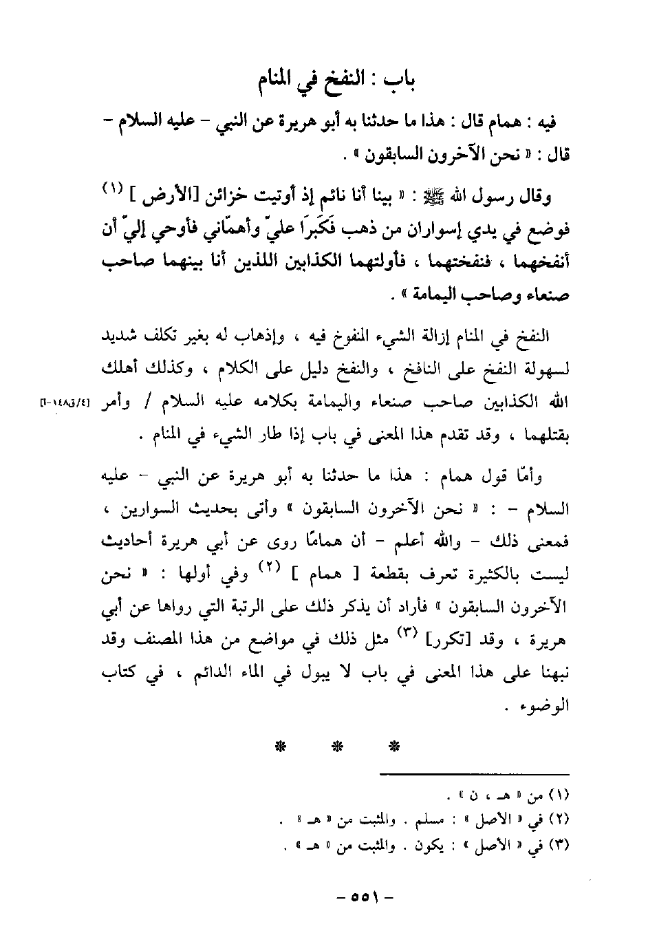 / 30 - فيه: هَمَّام، قَالَ: هَذَا مَا حَدَّثَنَا بِهِ أَبُو هُرَيْرَةَ، عَنْ النَّبِىّ (صلى الله عليه وسلم) قَالَ: (نَحْنُ الآخِرُونَ السَّابِقُونَ) ، وَقَالَ رَسُولُ اللَّهِ (صلى الله عليه وسلم) : (بَيْنَا أَنَا نَائِمٌ؛ إِذْ أُوتِيتُ خَزَائِنَ الأرْضِ، فَوُضِعَ فِى يَدَىَّ سِوَارَانِ مِنْ ذَهَبٍ، فَكَبُرَا عَلَىَّ، وَأَهَمَّانِى، فَأُوحِىَ إِلَىَّ أَنِ انْفُخْهُمَا، فَنَفَخْتُهُمَا فَطَارَا، فَأَوَّلْتُهُمَا: الْكَذَّابَيْنِ اللَّذَيْنِ أَنَا بَيْنَهُمَا: صَاحِبَ صَنْعَاءَ، وَصَاحِبَ الْيَمَامَةِ) . النفخ فى المنام إزالة الشىء المنفوخ فيه، وإهاب له بغير تكلف شديد لسهولة النفخ على النافخ، والنفخ دليل على الكلام، وكذلك أهلك الله الكذابين صاحب صنعاء واليمامة بكلامه عليه السلام وأمر بقتليهما، وقد تقدم هذا المعنى فى باب إذا طار الشىء فى المنام. وأما قول همام: هذا ماحدثنا به أبو هريرة عن النبى (صلى الله عليه وسلم) : (نحن الآخرون السابقون) وأتى بحديث السوارين، فمعنى ذلك - والله أعلم - أن همامًا روى عن أبى هريرة أحاديث ليست بالكثيرة تعرف بقطعة همام وفى أولها: (نحن الآخرون السابقون) فأراد أن يذكر ذلك فى مواضع من هذا المصنف وقد نبهنا على هذا المعنى فى باب لايبول فى الماء الدائم، فى كتاب الوضوء.
