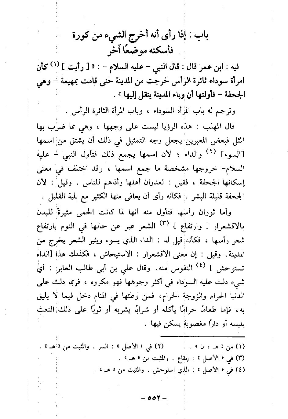 / 31 - فيه: ابْن عُمَر، قَالَ النَّبِى (صلى الله عليه وسلم) : (رَأَيْتُ كَأَنَّ امْرَأَةً سَوْدَاءَ ثَائِرَةَ الرَّأْسِ، خَرَجَتْ مِنَ الْمَدِينَةِ حَتَّى قَامَتْ بِمَهْيَعَةَ، وَهِى الْجُحْفَةُ، فَأَوَّلْتُ أَنَّ وَبَاءَ الْمَدِينَةِ نُقِلَ إِلَيْهَا) . وترجم له: باب المرأة السوداء، وباب المرأة الثائرة الرأس. قال المهلب: هذه الرؤيا ليست على وجهها، وهى مما ضرب بها المثل فبعض المعبرين يجهل وجه التمثيل فى ذلك فتأول النبى عليه السلام خروجها مشخصة ماجمع اسمها، وقد اختلف فى معنى إسكانها الجحفة، فقيل: لعدوان أهلها وأذاهم للناس. وقيل: لأن الجحفة قليلة البشر. فكأنه رأى أن يعافى منها الكثير مع بلية القليل. وأما ثوران راسها فتأول منه أنها لما كانت الحمى مثيرة للبدن بالاقشعرار وارتفاع الشعر عبر عن حالها فى النوم باتفاح شعر رأسها، فكأنه قيل له: الداء الذى يسوء ويثير الشعر يخرج من المدينة. وقيل: إن معنى الاقشعرار: الاستيحاش، فكذلك هذا الداء تستوحش النفوس منه. وقال على بن أبى طالب العابر: أى شىء دلت عليه السوداء فى أكثر وجوهها فهو مكروه، فربما دلت على الدنيا الحرام والزوجة الحرام، فمن وطئها فى المنام دخل فيما لايليق به، فإما طعامًا حرامًا يأكله أو شرابًا يشربه أو ثوبًا على ذلك النعت يلبسه أو دارًا مغصوبة يسكن فيها.