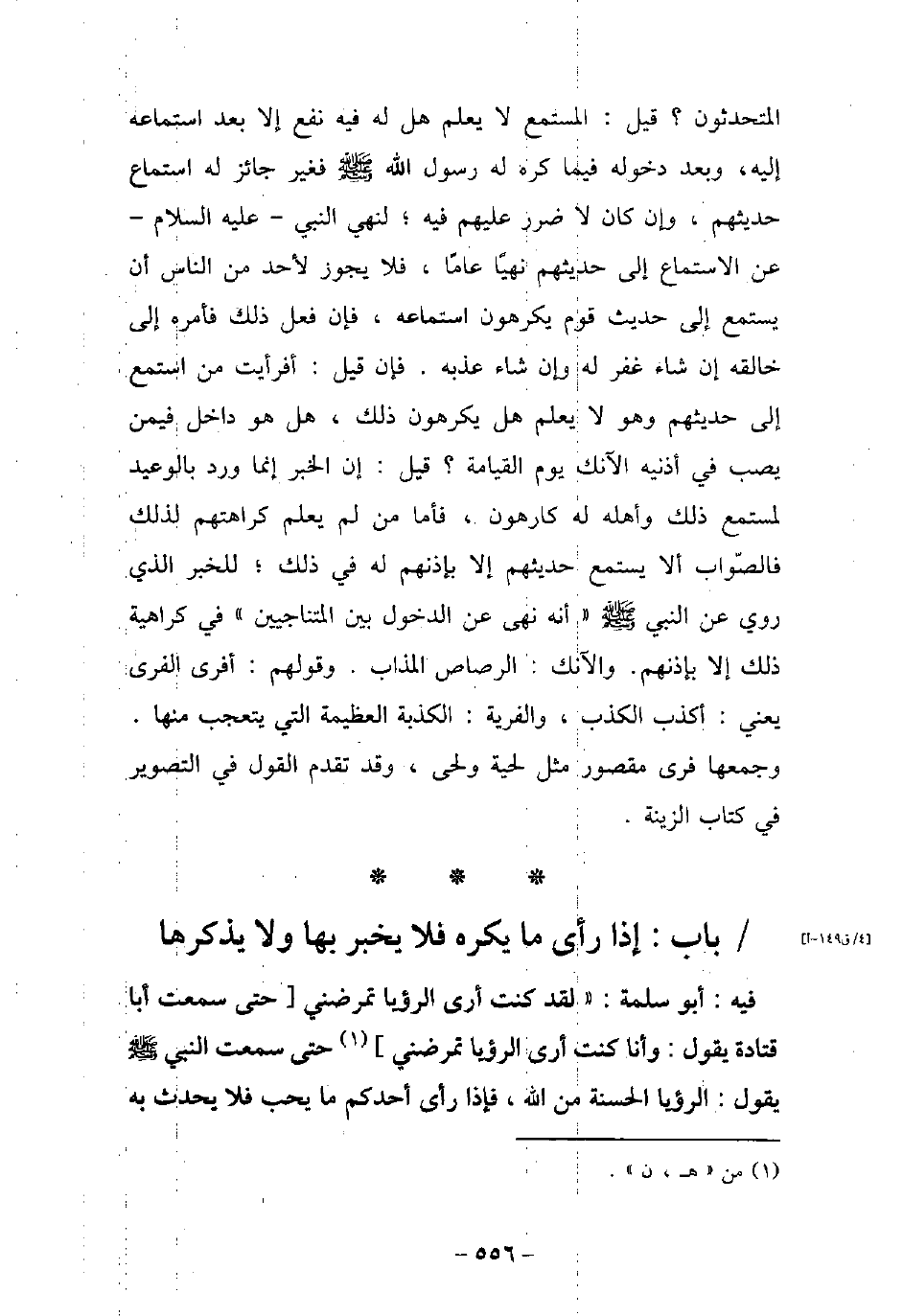المتحدثون؟ قيل: المستمع لا يعلم هل له فيه نفع إلا بعد استماعه إليه، وبعد دخوله فيما كره له رسول الله عليه السلام فغير جائز له اسماع حديثهم، وإن كان ضرر عليهم فيه؛ لنهى النبى عليه السلام عن الاستماع إلى حديثهم نهيًا عامًا، فلا يجوز لأحد من الناس أن يستمع إلى حديث قوم يكرهون استماعه، فإن فعل ذلك فأمره إلى خالفه إن شاء غفر له وإن شاء عذبه. فإن قيل: أفرأيت من استمع إلى حديثهم وهو لايعلم هل يكرهون ذلك، هل هو داخل فيمن يصب فى أذنيه الآنك يوم القيامة؟ قيل: إن الخبر إنما ورد بالوعيد لمستمع ذلك وأهله له كارهون، فأما من لم يعلم كراهتهم لذلك فالصواب ألا يستمع حديثهم ألا بإذنهم له في ذلك؛ للخبر الذي روى عن النبى (صلى الله عليه وسلم) : (أنه نهى عن الدخول بين المتناجيين) فى كراهية ذلك إلا بإذنهم. والآنك: الرصاص المذاب. وقولهم: أفرى الفرى يعنى: أكذب الكذب، والفرية: الكذبة العظيمة التى يتعجب منها. وجمعهافرى مقصور مثل لحية ولحى، وقد تقدم القول فى التصوير فى كتاب الزينة.