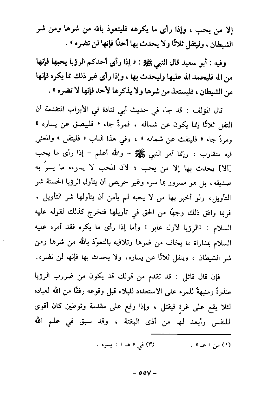 إِلا مَنْ يُحِبُّ، وَإِذَا رَأَى مَا يَكْرَهُ، فَلْيَتَعَوَّذْ بِاللَّهِ مِنْ شَرِّهَا، وَمِنْ شَرِّ الشَّيْطَانِ، وَلْيَتْفِلْ ثَلاثًا، وَلا يُحَدِّثْ بِهَا أَحَدًا فَإِنَّهَا لَنْ تَضُرَّهُ) . / 36 - وفيه: أَبُو سَعِيد، قَالَ النَّبِىّ (صلى الله عليه وسلم) : (إِذَا رَأَى أَحَدُكُمُ الرُّؤْيَا يُحِبُّهَا، فَإِنَّهَا مِنَ اللَّهِ، فَلْيَحْمَدِ اللَّهَ عَلَيْهَا، وَلْيُحَدِّثْ بِهَا، وَإِذَا رَأَى غَيْرَ ذَلِكَ مِمَّا يَكْرَهُ، فَإِنَّمَا هِى مِنَ الشَّيْطَانِ، فَلْيَسْتَعِذْ مِنْ شَرِّهَا، وَلا يَذْكُرْهَا لأحَدٍ فَإِنَّهَا لَنْ تَضُرَّهُ) . قال المؤلف: جاء فى حديث أبى قتادة فى الأبواب المتقدمة أن التفل ثلاثًا إنما يكون عن شماله، فمرة جاء (فليبصق عن يساره) ومرة جاء (فلينفث عن شماله) ، وفى هذا الباب (فليتفل) والمعنى فيه تقارب، وإنما أمر الله عليه السلام - والله أعلم - إذا رأى ما يحب إلا يحدث بها إلا من يحب؛ لأن المحب لايسوءه مايسر به صديقه، بل هو مسرور بما سره وغير حريص أن يتأول الرؤيا الحسنة شر التأويل، ولو أخبر بها من لايحبه لم يأمن أن يتأولها شر التأويل، فربما وافق ذلك وجهًا من الحق فى تأويلها فتخرج كذلك لقوله عليه السلام: (الرؤيا لأول عابر) وأما إذا رأى ما يكره فقد أمره عليه السلام بمداة مايخاف من ضرها وتلافيه بالتعوذ بالله من شرها ومن شر الشيطان، ويتفل ثلاثًا عن يساره، ولايحدث بها فإنها لن تضره. فإن قال قائل: قد تقدم من قولك قد يكون من ضروب الرؤيا منذرة ومنبهة للمرء على الاستعداد للبلاء قبل وقوعه رفقًا من الله لعباده لئلا يقع وعلى غرة فيقتل، وإذا وقع على مقدمة وتوطين كان أقوى للنفس وابعد لها من أذى البغتة، وقد سبق في علم الله