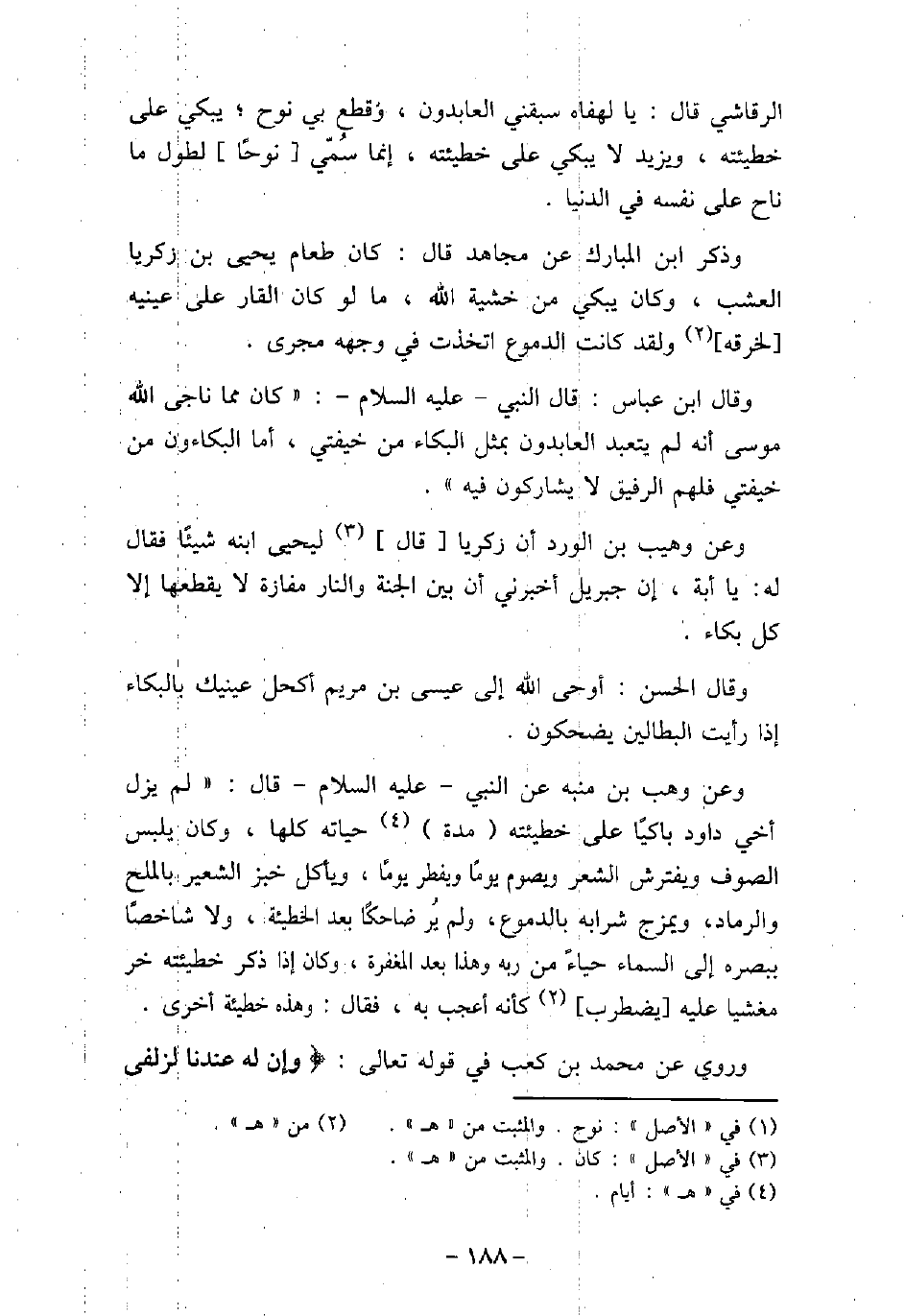 الرقاشى قال: يا لهفاه سبقنى العابدون، وقطع بى نوح؛ يبكى على خطيئته، ويزيد لا يبكى على خطيئته، إنما سُمّى نوحًا لطول ما ناح على نفسه فى الدنيا. وذكر ابن المبارك عن مجاهد قال: كان طعام يحيى بن زكريا العشب، وكان يبكى من خشية الله، ما لو كان القار على عينيه لخوفه ولقد كانت الدموع اتخذت فى وجهه مجرى. وقال ابن عباس: قال النبي - عليه السلام -: (كان مما ناجى الله موسى أنه لم يتعبد العابدون بمثل البكاء من خيفتى، أما البكاءون من خيفتى فلهم الرفيق لا يشاركون فيه) . وعن وهيب بن الورد أن زكريا قال ليحيى ابنه شيئًا فقال له: يا أبة، إن جبريل أخبرنى أن بين الجنة والنار مفازة لا يقطعها إلا كل بكاء. وقال الحسن: أوحى الله إلى عيسى ابن مريم: أكحل عينيك بالبكاء إذا رأيت البطالين يضحكون. وعن وهب بن منبه عن النبي - عليه السلام - قال: (لم يزل أخى داود باكيًا على خطيئته مدة حياته كلها) ، وكان يلبس الصوف ويفترش الشعر ويصوم يومًا ويفطر يومًا، ويأكل خبز الشعير بالملح والرماد، ويمزج شرابه بالدموع، ولم يُر ضاحكًا بعد الخطيئة، ولا شاخصًا ببصره إلى السماء حياءً من ربه وهذا بعد المغفرة، وكان إذا ذكر خطيئته خر مغشيا عليه يضطرب كأنه أعجب به، فقال: وهذه خطيئة أخرى. وروى عن محمد بن كعب فى قوله تعالى: (وَإِنَّ لَهُ عِندَنَا لَزُلْفَى