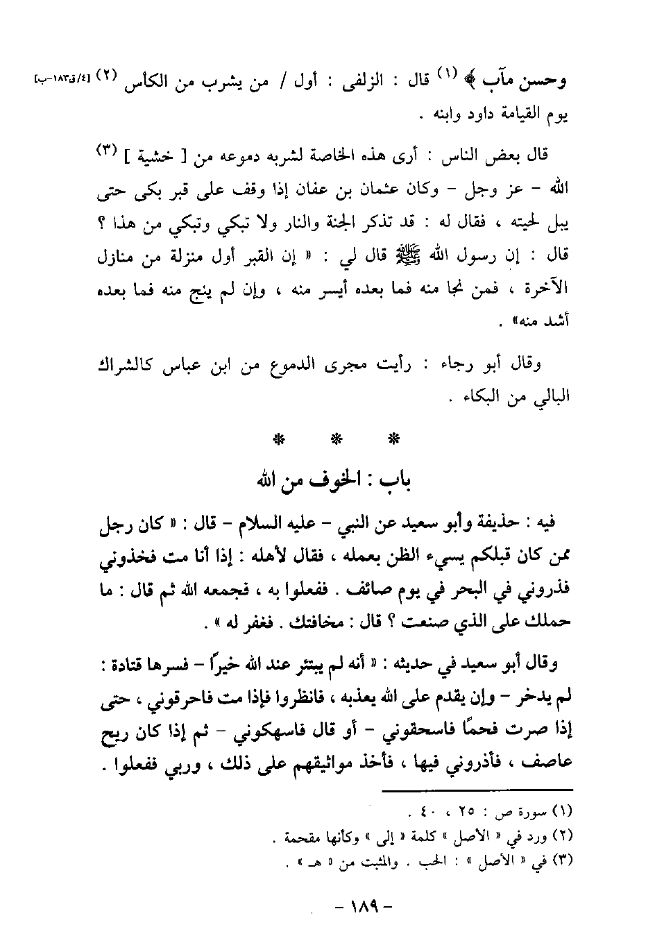 وَحُسْنَ مَآبٍ} [ص: 25] ، قال: الزلفى: أول من يشرب من الكأس يوم القيامة داود وابنه. قال بعض الناس: أرى هذه الخاصة لشربه دموعه من خشية الله عز وجل وكان عثمان بن عفان إذا وقف على قبر بكى حتى يبل لحيته، فقيل له: قد تذكر الجنة والنار ولا تبكى وتبكى من هذا؟ قال: رسول الله (صلى الله عليه وسلم) قال لى: (إن القبر أول منزلة من منازل الآخرة، فمن نجا منه فما بعده أيسر منه، وإن لم ينج منه فما بعده أشد منه) . وقال أبو رجاء: رأيت مجرى الدموع من ابن عباس كالشراك البالى من البكاء.