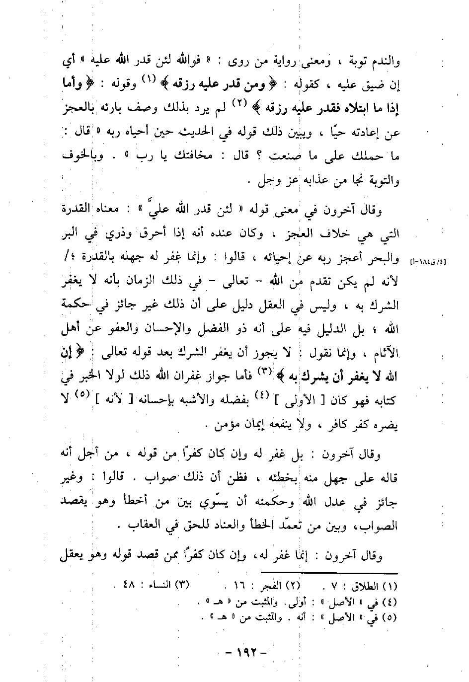 والندم توبة، ومعنى رواية من روى: (فوالله لئن قدر الله عليه) أى ضيق عليه، كقوله: (وَمَن قُدِرَ عَلَيْهِ رِزْقُهُ) [الطلاق: 7] ، وقوله: (وَأَمَّا إِذَا مَا ابْتَلاَهُ فَقَدَرَ عَلَيْهِ رِزْقَهُ) [الفجر: 16] ، لم يرد بذلك وصف بارئه بالعجز عن إعادته حيًا، ويبين ذلك قوله فى الحديث حين أحياه ربه (قال: ما حملك على ما صنعت؟ قال: مخافتك يا رب) . وبالخوف والتوبة نجا من عذابه عز وجل. وقال آخرون فى معنى قوله (لئن قدر الله علىَّ) : معناه القدرة التى هى خلاف العجز، وكان عنده أنه إذا أحرق وذرى فى البر والبحر أعجز ربه عن إحيائه، قالوا: وإنما غفر له جهله بالقدرة؛ لأنه لم يكن تقدم من الله تعالى فى ذلك الزمان بأنه لا يغفر الشرك به، وليس فى العقل دليل على أن ذلك غير جائز فى حكمة الله؛ بل الدليل فيه على أنه ذو الفضل والإحسان والعفو عن أهل الآثام، وإنما نقول: لا يجوز أن يغفر الشرك بعد قوله تعالى: (إِنَّ اللهَ لاَ يَغْفِرُ أَن يُشْرَكَ بِهِ) [النساء: 48] ، فأما جواز غفران الله ذلك لولا الخبر فى كتابه فهو كان الأولى بفضله والأشبه بإحسانه لأنه لا يضره كفر كافر، ولا ينفعه إيمان مؤمن. وقال آخرون: بل غفر له وإن كان كفرًا من قوله، من أجل أنه قاله على جهل منه بخطئه؛ فظن أن ذلك صواب. قالوا: وغيرجائز فى عدل الله وحكمته أن يسّوى بين من أخطأ وهو يقصد الصواب، وبين من تعمّد الخطأ والعناد للحق فى العقاب. وقال آخرون: إنما غفر له، وإن كان كفرًا ممن قصد قوله وهو يعقل