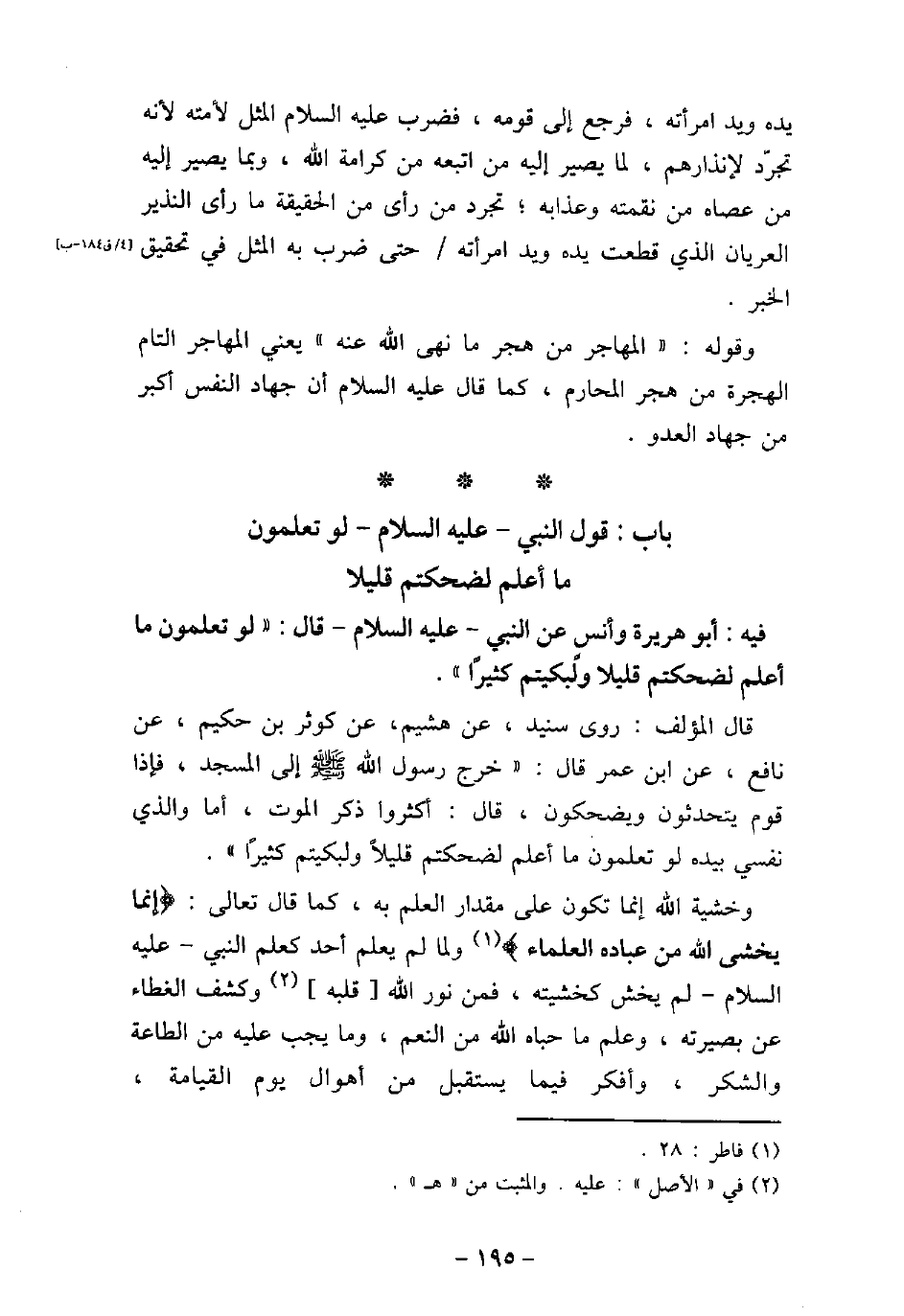 - بَاب قَوْلِ النَّبِيِّ - عليه السلام -: (لَوْ تَعْلَمُونَ مَا أَعْلَمُ لَضَحِكْتُمْ قَلِيلا