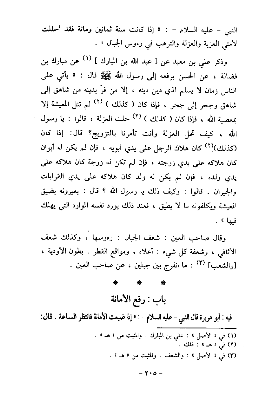 النبي - عليه السلام - (إذا كانت سنة ثمانين ومائة فقد أحللت لأمتي العزبة والعزلة والترهب فى رءوس الجبال) . وذكر على بن معبد عن عبد الله بن المبارك عن مبارك بن فضالة، عن الحسن يرفعه إلى رسول الله (صلى الله عليه وسلم) قال: (يأتى على الناس زمان لا يسلم لذى دين دينه، إلا من فرّ بدينه من شاهق إلى شاهق وحجر إلى حجر، فإذا كان كذلك لم تنل المعيشة إلا بمعصية الله، فإذا كان كذلك حلت العزلة، قالوا: يا رسول الله، كيف تحل العزلة وأنت تأمرنا بالتزويج؟ قال: إذا كان كذلك كان هلاك الرجل على يدى أبويه، فإن لم يكن له أبوان كان هلاكه على يدى زوجته، فإن لم تكن له زوجة كان هلاكه على يدى ولده، فإن لم يكن له ولد كان هلاكه على يدى القرابات والجيران. قالوا: وكيف ذلك يا رسول الله؟ قال: يعيرونه بضيق المعيشة ويكلفونه ما لا يطيق، فعند ذلك يورد نفسه الموارد التى يهلك فيها) . وقال صاحب العين: شعف الجبال: رءوسها، وكذلك شعف الأثافى، وشعفة كل شىء: أعلاه، ومواقع القطر: بطون الأودية، والشعب: ما انفرج بين جبلين، عن صاحب العين.