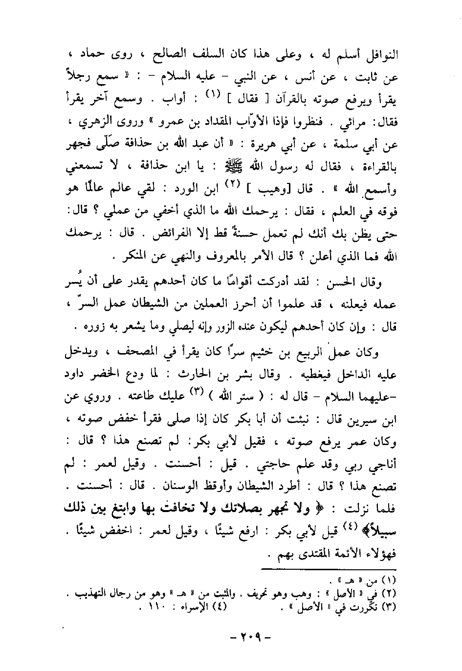 النوافل أسلم له، وعلى هذا كان السلف الصالح، روى حماد، عن ثابت، عن أنس، عن النبى (صلى الله عليه وسلم) أنه: (سمع رجلاً يقرأ ويرفع صوته بالقرآن فقال: أواب. وسمع آخر يقرأ فقال: مرائى. فنظروا فإذا الأوّاب المقداد بن عمرو) وروى الزهرى، عن أبى سلمة، عن أبى هريرة: (أن عبد الله بن حذافة صَلّى فجهر بالقراءة، فقال له رسول الله (صلى الله عليه وسلم) : يا ابن حذافة، لا تسمعنى وأسمع الله) . قال وهيب بن الورد: لقى عالم عالمًا هو فوقه فى العلم، فقال: يرحمك الله ما الذى أخفى من عملى؟ قال: حتى يظن بك أنك لم تعمل حسنةً قط إلا الفرائض. قال: يرحمك الله فما الذى أعلن؟ قال الأمر بالمعروف والنهى عن المنكر. وقال الحسن: لقد أدركت أقوامًا ما كان أحدهم يقدر على أن يُسر عمله فيعلنه، قد علموا أن أحرز العملين من الشيطان عمل السرّ، قال: وإن كان أحدهم ليكون عنده الزور وإنه ليصلى وما يشعر به زوره. وكان عمل الربيع بن خثيم سرًا كان يقرأ فى المصحف، ويدخل عليه الداخل فيغطيه. وقال بشر بن الحارث: لما ودع الخضر داود، عليهما السلام، قال له: ستر الله عليك بطاعته. وروى عن ابن سيرين قال: نبئت أن أبا بكر كان إذا صلى فقرأ خفض صوته، وكان عمر يرفع صوته، فقيل لأبى بكر: لم تصنع هذا؟ قال: أناجى ربى وقد علم حاجتى. قيل: أحسنت. وقيل لعمر: لم تصنع هذا؟ قال: أطرد الشيطان وأوقظ الوسنان. قال: أحسنت. فلما نزلت: (وَلاَ تَجْهَرْ بِصَلاَتِكَ وَلاَ تُخَافِتْ بِهَا وَابْتَغِ بَيْنَ ذَلِكَ سَبِيلاً) [الإسراء: 110] ، قيل لأبى بكر: ارفع شيئًا، وقيل لعمر: اخفض شيئًا. فهؤلاء الأئمة المقتدى بهم.