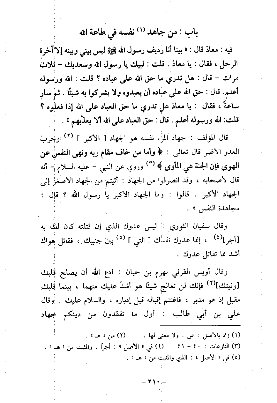 / 73 - فيه: مُعَاذ، قَالَ: بَيْنَمَا أَنَا رَدِيفُ رسُول اللَّه (صلى الله عليه وسلم) لَيْسَ بَيْنِى وَبَيْنَهُ إِلا آخِرَةُ الرَّحْلِ، فَقَالَ: (يَا مُعَاذُ) ، قُلْتُ: لَبَّيْكَ يَا رَسُولَ اللَّهِ وَسَعْدَيْكَ، ثلاث مرات، قَالَ: (هَلْ تَدْرِى مَا حَقُّ اللَّهِ عَلَى عِبَادِهِ) ؟ قُلْتُ: اللَّهُ وَرَسُولُهُ أَعْلَمُ، قَالَ: (حَقُّ اللَّهِ عَلَى عِبَادِهِ أَنْ يَعْبُدُوهُ وَلا يُشْرِكُوا بِهِ شَيْئًا) ، ثُمَّ سَارَ سَاعَةً، فَقَالَ: (يَا مُعَاذُ، هَلْ تَدْرِى مَا حَقُّ الْعِبَادِ عَلَى اللَّهِ إِذَا فَعَلُوهُ) ؟ قُلْتُ: اللَّهُ وَرَسُولُهُ أَعْلَمُ، قَالَ: (حَقُّ الْعِبَادِ عَلَى اللَّهِ أَنْ لا يُعَذِّبَهُمْ) . قال المؤلف: جهاد المرء نفسه هو الجهاد الأكبر وحرب العدو الأضر قال تعالى: (وَأَمَّا مَنْ خَافَ مَقَامَ رَبِّهِ وَنَهَى النَّفْسَ عَنِ الْهَوَى فَإِنَّ الْجَنَّةَ هِىَ الْمَأْوَى) [النازعات: 40، 41] . وروى عن النبى (صلى الله عليه وسلم) أنه قال لأصحابه، وقد انصرفوا من الجهاد: (أتيتم من الجهاد الأصغر إلى الجهاد الأكبر. قالوا: وما الجهاد الأكبر يا رسول الله؟ قال: مجاهدة النفس) . وقال سفيان الثورى: ليس عدوك الذى إن قتلته كان لك به أجر، إنما عدوك نفسك التى بين جنبيك، فقاتل هواك أشد مما تقاتل عدوك. وقال أويس القرني لهرم بن حيان: ادع الله أن يصلح قلبك ونيتك فإنك لن تعالج شيئًا هو أشدّ عليك منهما، بينما قلبك مقبل إذ هو مدبر، فاغتنم إقباله قبل إدباره، والسلام عليك. وقال علي بن أبي طالب: أول ما تفقدون من دينكم جهاد