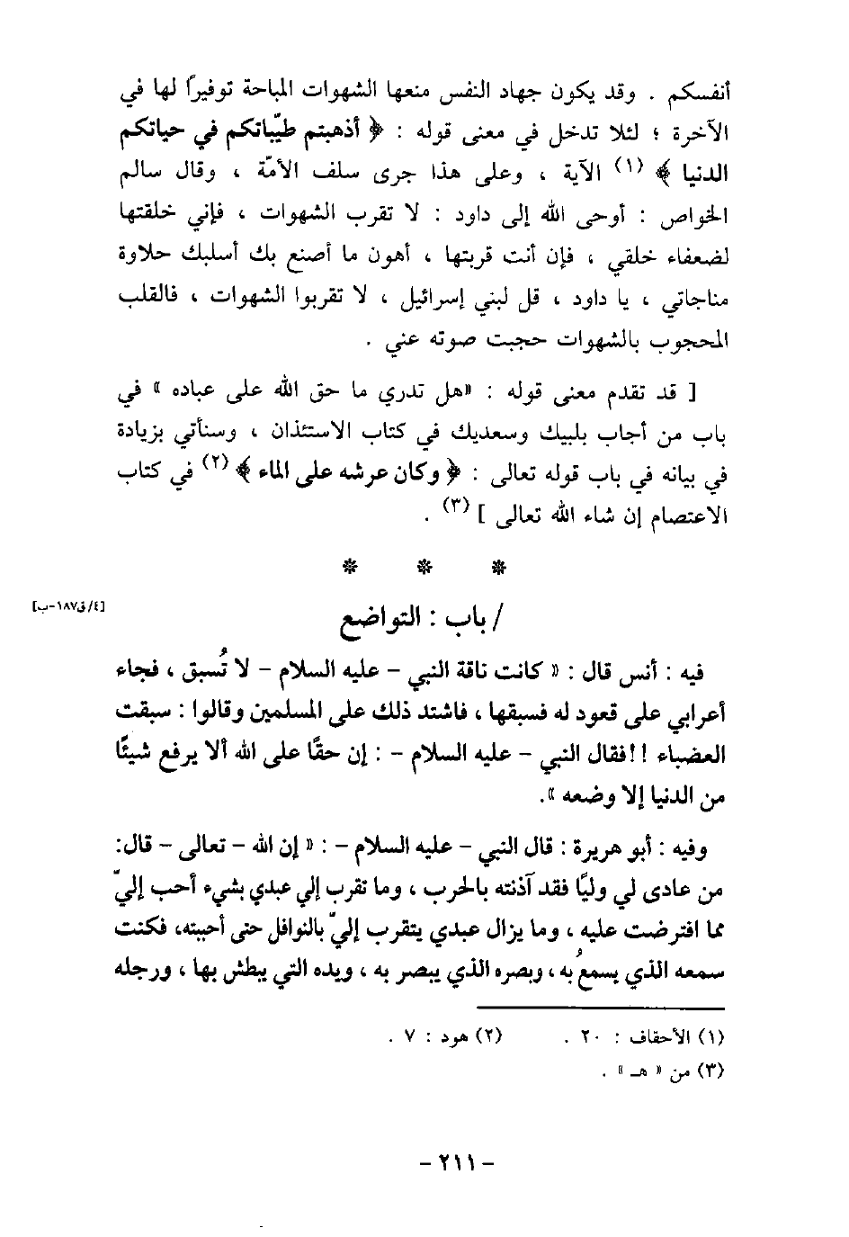 / 74 - فيه: أَنَس، كَانَتْ نَاقَة النَّبِىّ، لا تُسْبَقُ، فَجَاءَ أَعْرَابِىٌّ عَلَى قَعُودٍ لَهُ فَسَبَقَهَا، فَاشْتَدَّ ذَلِكَ عَلَى الْمُسْلِمِينَ، وَقَالُوا: سُبِقَتِ الْعَضْبَاءُ، فَقَالَ النَّبِىّ (صلى الله عليه وسلم) : (إِنَّ حَقًّا عَلَى اللَّهِ أَنْ لا يَرْفَعَ شَيْئًا مِنَ الدُّنْيَا إِلا وَضَعَهُ) . / 75 - وفيه: أَبُو هُرَيْرَةَ، قَالَ النَّبِىّ (صلى الله عليه وسلم) : (إِنَّ اللَّهَ تَعَالَى قَالَ: مَنْ عَادَى لِى وَلِيًّا، فَقَدْ آذَنْتُهُ بِالْحَرْبِ، وَمَا تَقَرَّبَ إِلَىَّ عَبْدِى بِشَىْءٍ أَحَبَّ إِلَىَّ مِمَّا افْتَرَضْتُ عَلَيْهِ، وَمَا يَزَالُ عَبْدِى يَتَقَرَّبُ إِلَىَّ بِالنَّوَافِلِ حَتَّى أُحِبَّهُ، فَإِذَا أَحْبَبْتُهُ كُنْتُ سَمْعَهُ الَّذِى يَسْمَعُ بِهِ، وَبَصَرَهُ الَّذِى يُبْصِرُ بِهِ، وَيَدَهُ الَّتِى يَبْطِشُ بِهَا، وَرِجْلَهُ