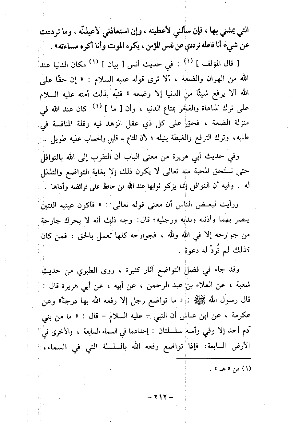 الَّتِي يَمْشِى بِهَا، وَإِنْ سَأَلَنِى لأعْطِيَنَّهُ، وَلَئِنِ اسْتَعَاذَنِى لأعِيذَنَّهُ، وَمَا تَرَدَّدْتُ عَنْ شَىْءٍ أَنَا فَاعِلُهُ تَرَدُّدِى عَنْ نَفْسِ الْمُؤْمِنِ يَكْرَهُ الْمَوْتَ، وَأَنَا أَكْرَهُ مَسَاءَتَهُ) . قال المؤلف: فى حديث أنس بيان مكان الدنيا عند الله من الهوان والضعة، ألا ترى قوله (صلى الله عليه وسلم) : (إن حقًا على الله ألا يرفع شيئًا من الدنيا إلا وضعه) فنبّه بذلك أمته (صلى الله عليه وسلم) على ترك المباهاة والفخر بمتاع الدنيا، وأن ما كان عند الله فى منزلة الضعة، فحق على كل ذى عقل الزهد فيه وقلة المنافسة فى طلبه، وترك الترفع والغبطة بنيله، لأن المتاع به قليل والحساب عليه طويل. وفى حديث أبى هريرة من معنى الباب أن التقرب إلى الله بالنوافل حتى تستحق المحبة منه تعالى لا يكون ذلك إلا بغاية التواضع والتذلل له. وفيه أن النوافل إنما يزكو ثوابها عند الله لمن حافظ على فرائضه وأداها. ورأيت لبعض الناس أن معنى قوله تعالى: (فأكون عينيه اللتين يبصر بهما وأذنيه ويديه ورجليه) قال: وجه ذلك أنه لا يحرك جارحة من جوارحه إلا فى الله ولله، فجوارحه كلها تعمل بالحق، فمن كان كذلك لم تُردّ له دعوة. وقد جاء فى فضل التواضع آثار كثيرة، روى الطبرى من حديث شعبة، عن العلاء بن عبد الرحمن، عن أبيه، عن أبى هريرة قال: قال رسول الله (صلى الله عليه وسلم) : (ما تواضع رجل إلا رفعه الله بها درجةً) وعن عكرمة، عن ابن عباس أن النبى (صلى الله عليه وسلم) قال: (ما من بنى آدم أحد إلا وفى رأسه سلسلتان: إحداهما فى السماء السابعة، والأخرى فى الأرض السابعة، فإذا تواضع رفعه الله بالسلسلة التى فى السماء،