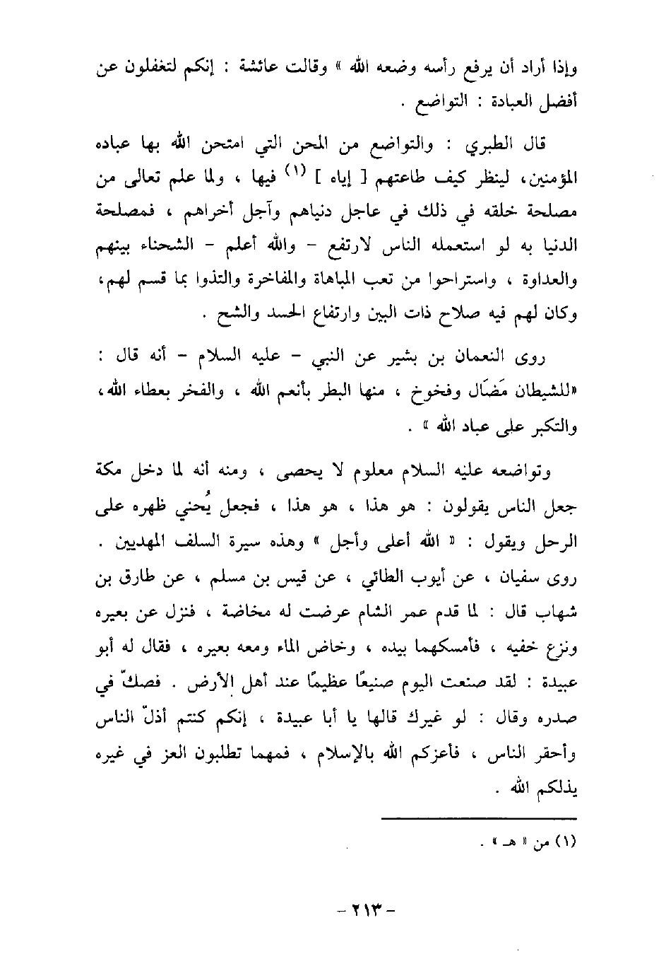 وإذا أراد أن يرفع رأسه وضعه الله) وقالت عائشة: إنكم لتغفلون عن أفضل العبادة: التواضع. قال الطبرى: والتواضع من المحن التى امتحن الله بها عباده المؤمنين، لينظر كيف طاعتهم إياه فيها، ولما علم تعالى من مصلحة خلقه فى ذلك فى عاجل دنياهم وآجل أخراهم، فمصلحة الدنيا به لو استعمله الناس لارتفع والله أعلم الشحناء بينهم والعداوة، واستراحوا من تعب المباهاة والمفاخرة والتذوا بما قسم لهم، وكان لهم فيه صلاح ذات البين وارتفاع الحسد والشح. روى النعمان بن بشير عن النبى (صلى الله عليه وسلم) أنه قال: (للشيطان مَضاَل وفخوخ، منها البطر بأنعم الله، والفخر بعطاء الله، والتكبر على عباد الله) . وتواضعه (صلى الله عليه وسلم) معلوم لا يحصى، ومنه أنه لما دخل مكة جعل الناس يقولون: هو هذا، هو هذا، فجعل يُحنى ظهره على الرحل ويقول: (الله أعلى وأجل) وهذه سيرة السلف المهديين. روى سفيان، عن أيوب الطائى، عن قيس بن مسلم، عن طارق بن شهاب قال: لما قدم عمر الشام عرضت له مخاضة، فنزل عن بعيره ونزع خفيه، فأمسكهما بيده، وخاض الماء ومعه بعيره، فقال له أبو عبيدة: لقد صنعت اليوم صنيعًا عظيمًا عند أهل الأرض. فصكّ فى صدره وقال: لو غيرك قالها يا أبا عبيدة، إنكم كنتم أذّل الناس وأحقر الناس، فأعزكم الله بالإسلام، فمهما تطلبون العز فى غيره يذلكم الله.
