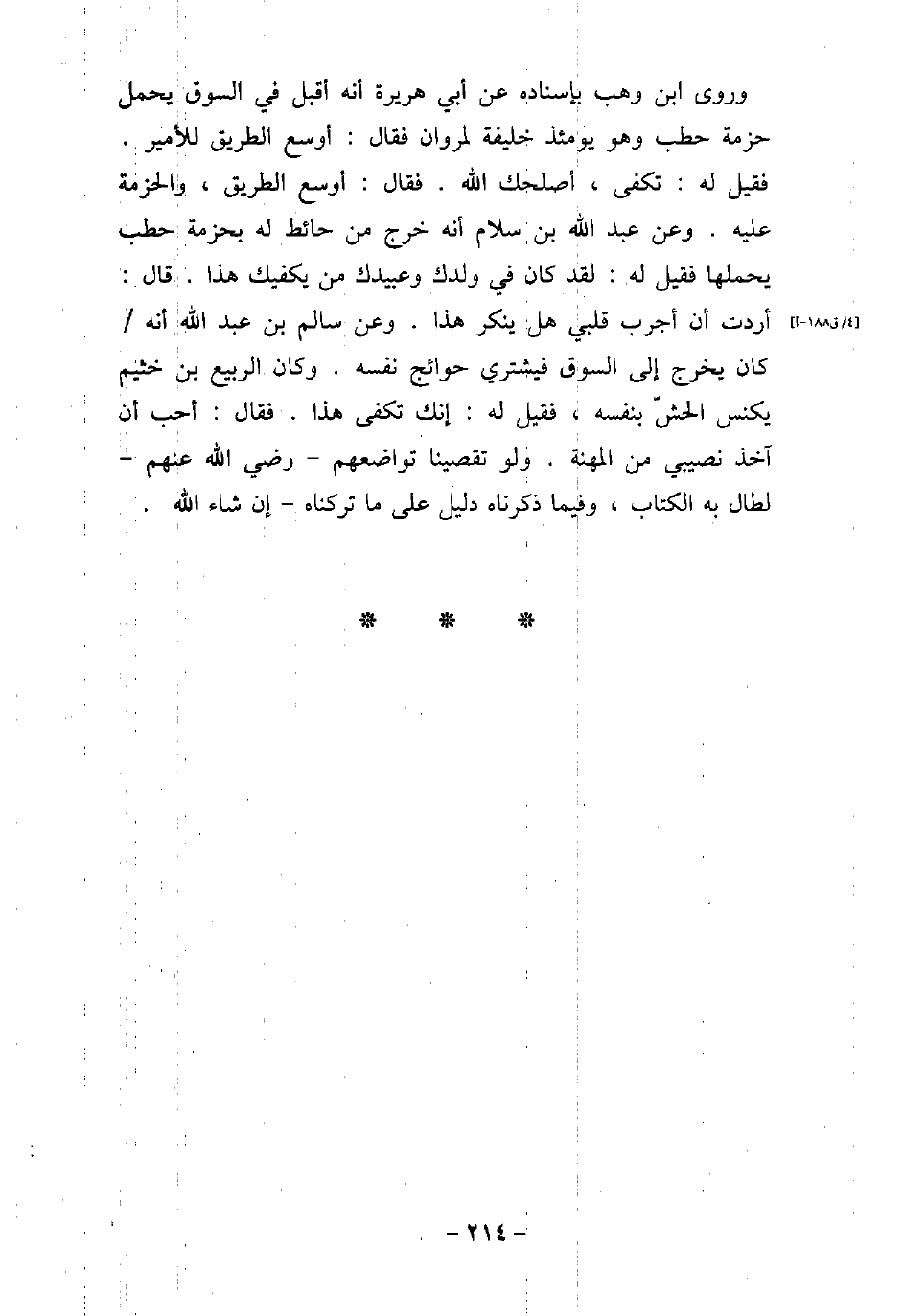 وروى ابن وهب بإسناده عن أبى هريرة أنه أقبل فى السوق يحمل حزمة حطب وهو يومئذ خليفة لمروان فقال: أوسع الطريق للأمير. فقيل له: تكفى، أصلحك الله. فقال: أوسع الطريق، والحزمة عليه. وعن عبد الله بن سلام أنه خرج من حائط له بحزمة حطب يحملها فقيل له: لقد كان فى ولدك وعبيدك من يكفيك هذا. قال: أردت أن أجرب قلبى هل ينكر هذا. وعن سالم بن عبد الله أنه كان يخرج إلى السوق فيشترى حوائج نفسه. وكان الربيع بن خثيم يكنس الحشّ بنفسه، فقيل له: إنك تكفى هذا. فقال: أحب أن آخذ نصيبى من المهنة. ولو تقصينا تواضعهم، رضى الله عنهم، لطال به الكتاب، وفيما ذكرناه دليل على ما تركناه إن شاء الله.