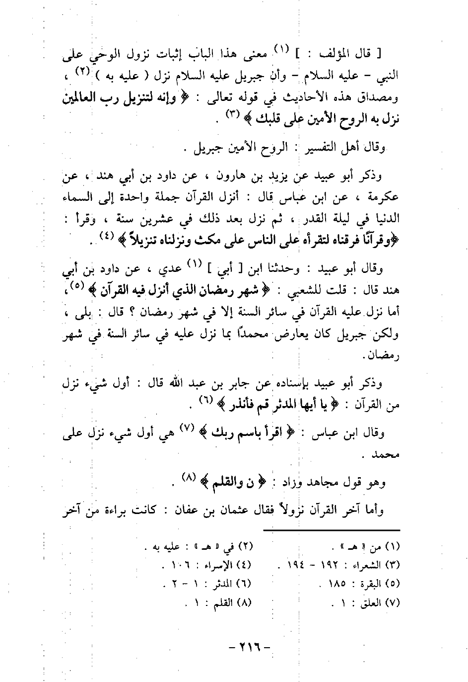 قال المؤلف: معنى هذا الباب إثبات نزول الوحي على النبي - عليه السلام - وأن جبريل - عليه السلام - نزل عليه به، ومصداق هذه الأحاديث في قوله تعالى: (وَإِنَّهُ لَتَنزِيلُ رَبِّ الْعَالَمِينَ نَزَلَ بِهِ الرُّوحُ الأَمِينُ عَلَى قَلْبِكَ) [الشعراء: 192 - 194] . وقال أهل التفسير: الروح الأمين جبريل. وذكر أبو عبيد عن يزيد بن هارون، عن داود بن أبى هند، عن عكرمة، عن ابن عباس قال: أنزل القرآن جملة واحدة إلى السماء الدنيا فى ليلة القدر، ثم نزل بعد ذلك فى عشرين سنة، وقرأ: (وَقُرْآنًا فَرَقْنَاهُ لِتَقْرَأَهُ عَلَى النَّاسِ عَلَى مُكْثٍ وَنَزَّلْنَاهُ تَنزِيلاً) [الإسراء: 106] . وقال أبو عبيد: وحدثنا ابن أبى عدى، عن داود بن أبى هند قال: قلت للشعبى: (شَهْرُ رَمَضَانَ الَّذِىَ أُنزِلَ فِيهِ الْقُرْآنُ) [البقرة: 185] ، أما نزل عليه القرآن فى سائر السنة إلا فى شهر رمضان؟ قال: بلى، ولكن جبريل كان يعارض محمدًا بما نزل عليه فى سائر السنة فى شهر رمضان. وذكر أبو عبيد بإسناده عن جابر بن عبد الله قال: أول شىء نزل من القرآن: (يَا أَيُّهَا الْمُدَّثِّرُ قُمْ فَأَنذِرْ) [المدثر: 1، 2] . قال ابن عباس: (اقْرَأْ بِاسْمِ رَبِّكَ) [العلق: 1] هى أول شىء نزل على محمد. وهو قول مجاهد وزاد: (ن وَالْقَلَمِ) [القلم: 1] . وأما آخر القرآن نزولاً، فقال عثمان بن عفان: كانت براءة من آخر
