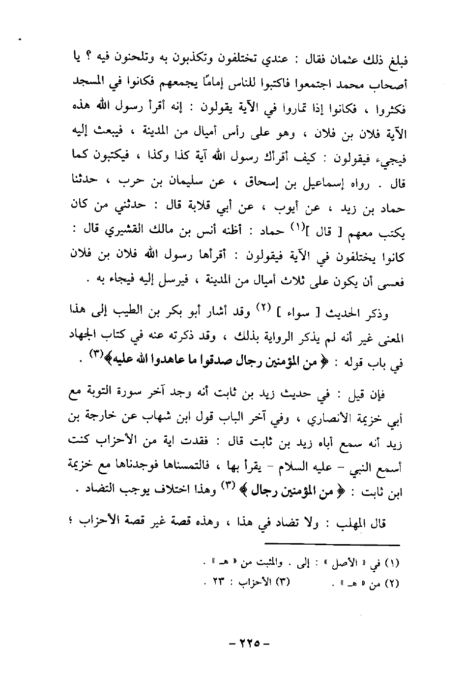فبلغ ذلك عثمان، فقال: عندى تختلفون وتكذبون به وتلحنون فيه؟ يا أصحاب محمد اجتمعوا، فاكتبوا للناس إمامًا يجمعهم، فكانوا فى المسجد فكثروا، فكانوا إذا تماروا فى الآية يقولون: إنه أقرأ رسول الله هذه الآية فلان بن فلان، وهو على رأس أميال من المدينة، فيبعث إليه فيجئ، فيقولون: كيف أقرأك رسول الله آية كذا وكذا؟ فيكتبون كما قال. رواه إسماعيل بن إسحاق، عن سليمان بن حرب، حدثنا حماد بن زيد، عن أيوب، عن أبى قلابة، قال: حدثنى من كان يكتب معهم، قال حماد: أظنه أنس بن مالك القشيرى، قال: كانوا يختلفون فى الآية، فيقولون: أقرأها رسول الله فلان بن فلان، فعسى أن يكون على ثلاث أميال من المدينة، فيرسل إليه فيجاء به. وذكر الحديث سواء وقد أشار أبو بكر بن الطيب إلى هذا المعنى غير أنه لم يذكر الرواية بذلك، وقد ذكرته فى كتاب الجهاد فى باب قوله: (مِنَ الْمُؤْمِنِينَ رِجَالٌ صَدَقُوا مَا عَاهَدُوا اللَّهَ عَلَيْهِ) [الأحزاب: 23] . فإن قيل: فى حديث زيد بن ثابت أنه وجد آخر سورة التوبة مع أبى خزيمة الأنصارى، وفى آخر الباب قول ابن شهاب عن خارجة بن زيد أنه سمع أباه زيد بن ثابت قال: فقدت آية من الأحزاب كنت أسمع النبى (صلى الله عليه وسلم) يقرأ بها، فالتمسناها فوجدناها مع خزيمة بن ثابت: (مِنَ الْمُؤْمِنِينَ رِجَالٌ) [الأحزاب: 23] وهذا اختلاف يوجب التضاد. قال المهلب: ولا تضاد فى هذا، وهذه غير قصة الأحزاب؛