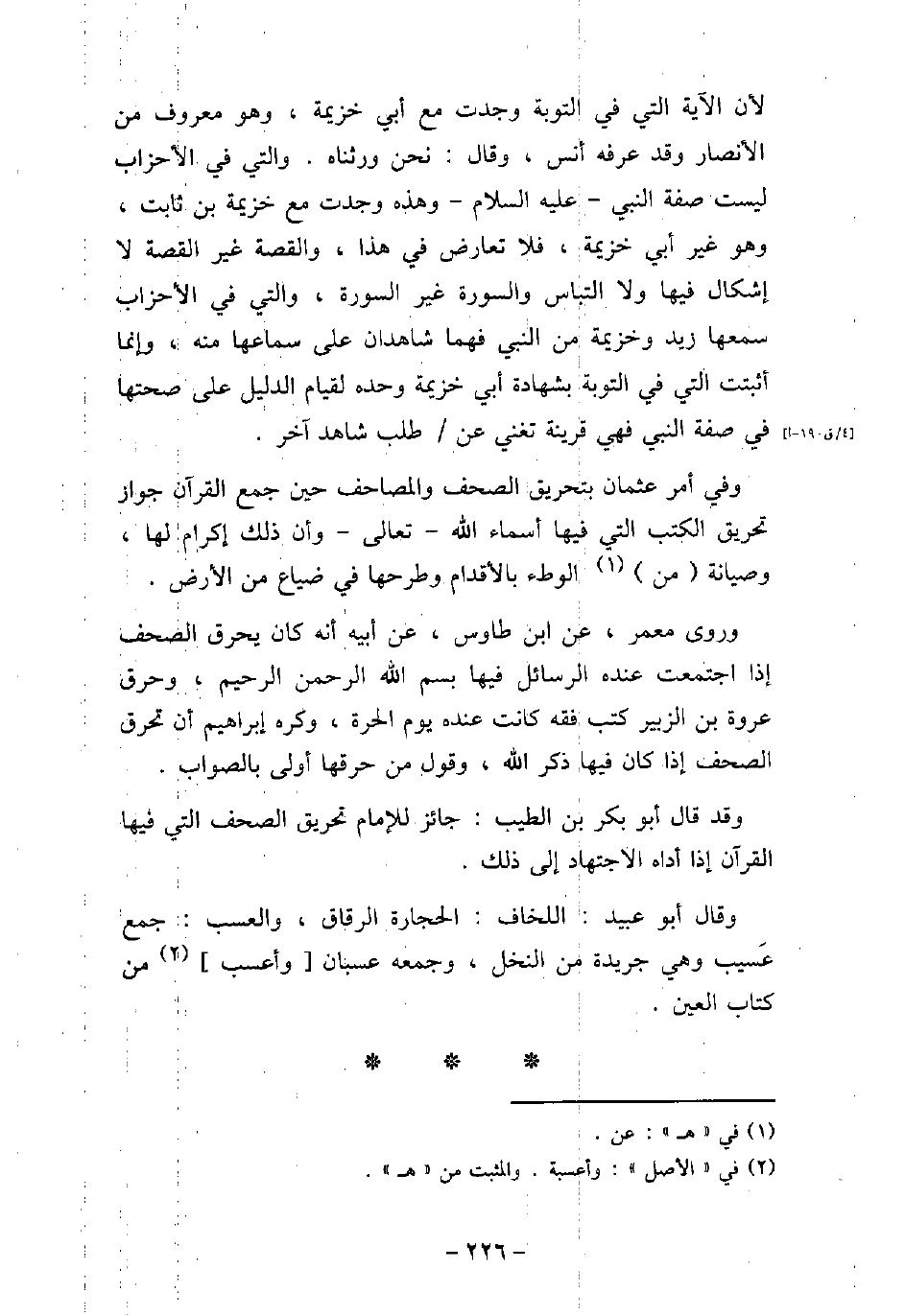 لأن الآية التي في التوبة مع أبي خزيمة، وهو معروف من الأنصار وقد عرفه أنس، وقال: نحن ورثناه. والتى فى الأحزاب ليست صفة النبى (صلى الله عليه وسلم) وهذه وجدت مع خزيمة بن ثابت، وهو غير أبى خزيمة، فلا تعارض فى هذا، والقصة غير القصة لا إشكال فيها ولا التباس والسورة غير السورة، والتى فى الأحزاب سمعها زيد وخزيمة من النبى فهما شاهدان على سماعها منه، وإنما أثبتت التى فى التوبة بشهادة أبى خزيمة وحده لقيام الدليل على صحتها فى صفة النبى فهى قرينة تغنى عن طلب شاهد آخر. وفى أمر عثمان بتحريق الصحف والمصاحف حين جمع القرآن جواز تحريق الكتب التى فيها أسماء الله تعالى وأن ذلك إكرام لها، وصيانة من الوطء بالأقدام وطرحها فى ضياع من الأرض. وروى معمر، عن ابن طاوس، عن أبيه أنه كان يحرق الصحف إذا اجتمعت عنده الرسائل فيها بسم الله الرحمن الرحيم، وحرق عروة بن الزبير كتب فقه كانت عنده يوم الحرة، وكره إبراهيم أن تحرق الصحف إذا كان فيها ذكر الله، وقول من حرقها أولى بالصواب. وقد قال أبو بكر بن الطيب: جائز للإمام تحريق الصحف التى فيها القرآن إذا أداه الاجتهاد إلى ذلك. وقال أبو عبيد: اللخاف: الحجارة الرقاق، والعسب: جمع عَسيب وهى جريدة من النخل، وجمعه عسبان وأعسب من كتاب العين.
