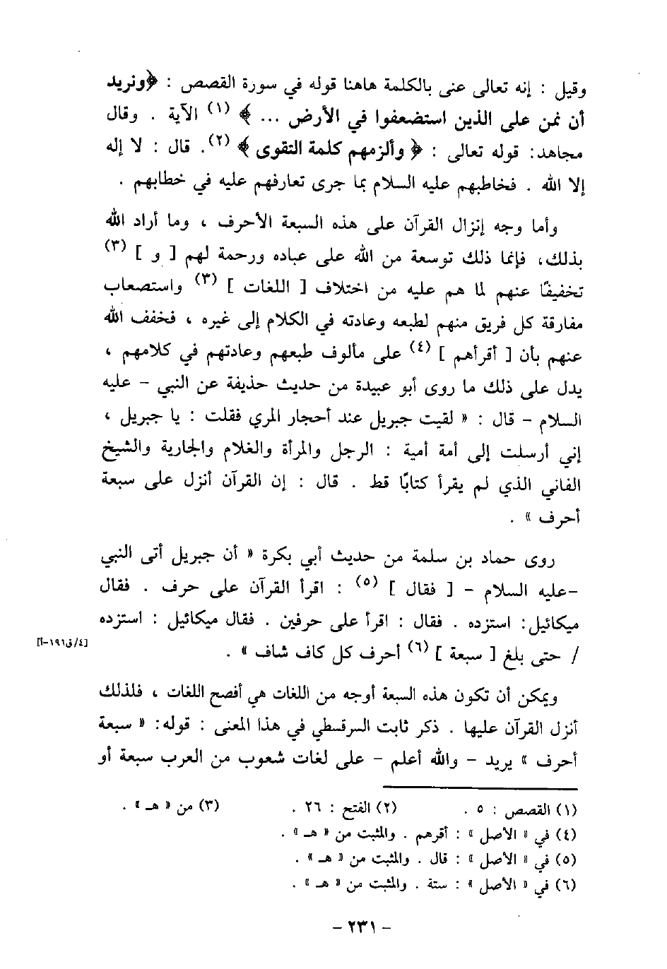 وقيل: إنه تعالى عنى بالكلمة هاهنا قوله فى سورة القصص: (وَنُرِيدُ أَن نَّمُنَّ عَلَى الَّذِينَ اسْتُضْعِفُوا فِي الأَرْضِ) [القصص: 5] الآية. وقال مجاهد: قوله تعالى: (وَأَلْزَمَهُمْ كَلِمَةَ التَّقْوَى) [الفتح: 26] ، قال: لا إله إلا الله. فخاطبهم (صلى الله عليه وسلم) بما جرى تعارفهم عليه فى خطابهم. وأما وجه إنزال القرآن على هذه السبعة الأحرف، وما أراد الله بذلك، فإنما ذلك توسعة من الله على عباده ورحمة لهم وتخفيفًا عنهم لما هم عليه من اختلاف اللغات واستصعاب مفارقة كل فريق منهم لطبعه وعادته فى الكلام إلى غيره، فخفف الله عنهم بأن أقرأهم على مألوف طبعهم وعادتهم فى كلامهم، يدل على ذلك ما روى أبو عبيدة من حديث حذيفة عن النبى (صلى الله عليه وسلم) قال: (لقيت جبريل عند أحجار المرى فقلت: يا جبريل، إنى أرسلت إلى أمة أمية: الرجل والمرأة والغلام والجارية والشيخ الفانى الذى لم يقرأ كتابًا قط. قال: إن القرآن أنزل على سبعة أحرف) . روى حماد بن سلمة من حديث أبى بكرة (أن جبريل أتى النبى (صلى الله عليه وسلم) فقال: اقرأ القرآن على حرف. فقال ميكائيل: استزده. فقال: اقرأ على حرفين. فقال ميكائيل: استزده حتى بلغ سبعة أحرف كل كاف شاف) . ويمكن أن تكون هذه السبعة أوجه من اللغات هى أفصح اللغات، فلذلك أنزل القرآن عليها. ذكر ثابت السرقطى فى هذا المعنى: قوله: (سبعة أحرف) يريد والله أعلم على لغات شعوب من العرب سبعة أو