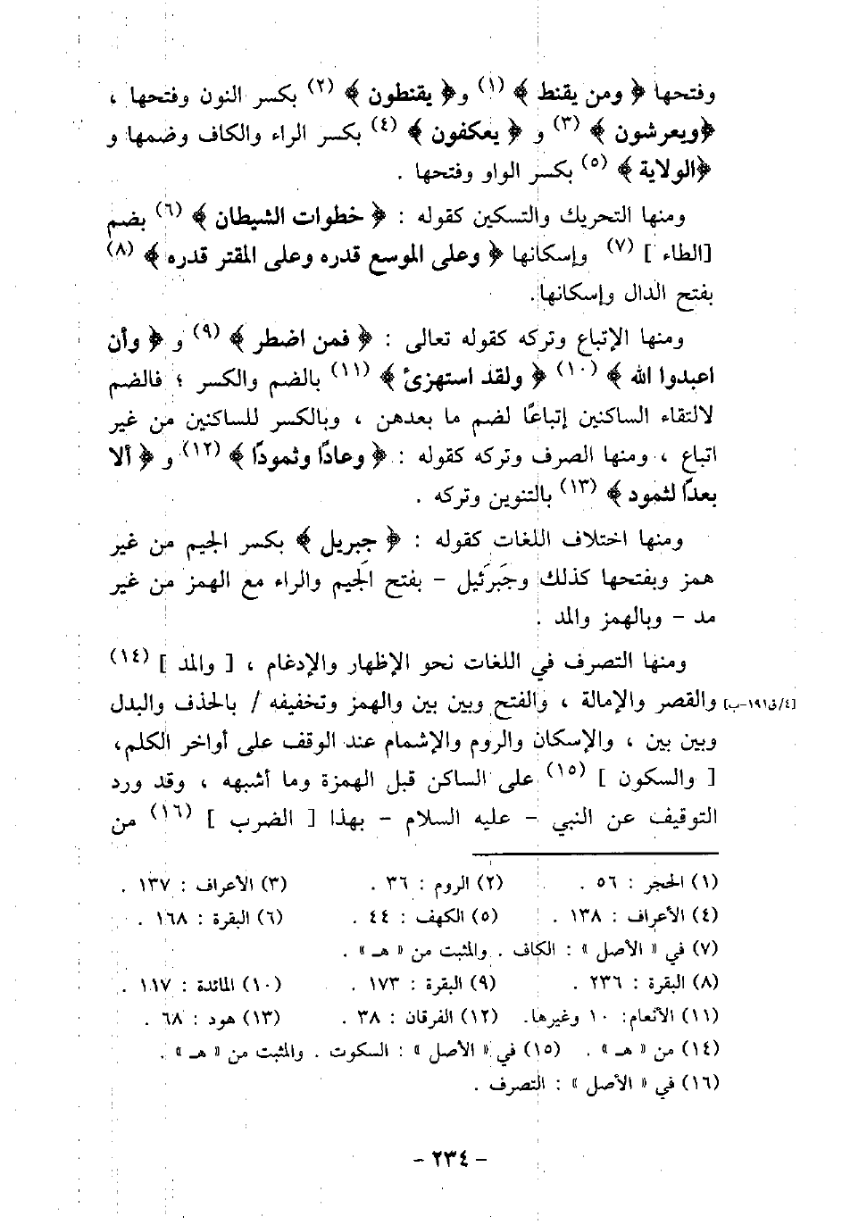 وفتحها) وَمَن يَقْنَطُ) [الحجر: 56] ، و) يَقْنَطُونَ) [الروم: 36] بكسر النون وفتحها، و) يَعْرِشُونَ) [الأعراف: 137] و) يَعْكُفُونَ) [الأعراف: 138] بكسر الراء والكاف وضمها و) الْوَلاَيَةُ) [الكهف: 44] بكسر الواو وفتحها. ومنها: التحريك والتسكين كقوله: (خُطُوَاتِ الشَّيْطَانِ) [البقرة: 168] بضم الطاء وإسكانها، و) عَلَى الْمُوسِعِ قَدَرُهُ وَعَلَى الْمُقْتِرِ قَدْرُهُ) [البقرة: 236] بفتح الدال وإسكانها. ومنها: الاتباع وتركه كقوله تعالى: (فَمَنِ اضْطُرَّ) [البقرة: 174] ، و) أَنِ اعْبُدُوا اللهَ) [المائدة: 117] ،) وَلَقَدِ اسْتُهْزِئَ) [الأنعام: 10] ، بالضم والكسر؛ فالضم لالتقاء الساكنين اتباعًا لضم ما بعدهن، وبالكسر للساكنين من غير اتباع، ومنها الصرف وتركه كقوله: (وَعَادٍ وَثَمُودَ) [التوبة: 70] ، و) أَلاَ بُعْدًا لِّثَمُودَ) [هود: 68] بالتنوين وتركه. ومنها: اختلاف اللغات كقوله: (جِبْرِيلَ (بكسر الجيم من غير همز، وبفتحها كذلك، وجَبرئيَل بفتح الجيم والراء مع الهمز من غير مد، وبالهمز والمد. ومنها: التصرف فى اللغات نحو الإظهار والإدغام، والمد والقصر والإمالة، والفتح وبين بين والهمز وتخفيفه بالحذف والبدل وبين بين، والإسكان والروم والإشمام عند الوقف على أواخر الكلم، والسكون على الساكن قبل الهمزة وما أشبهه، وقد ورد التوقيف عن النبى (صلى الله عليه وسلم) بهذا الضرب من