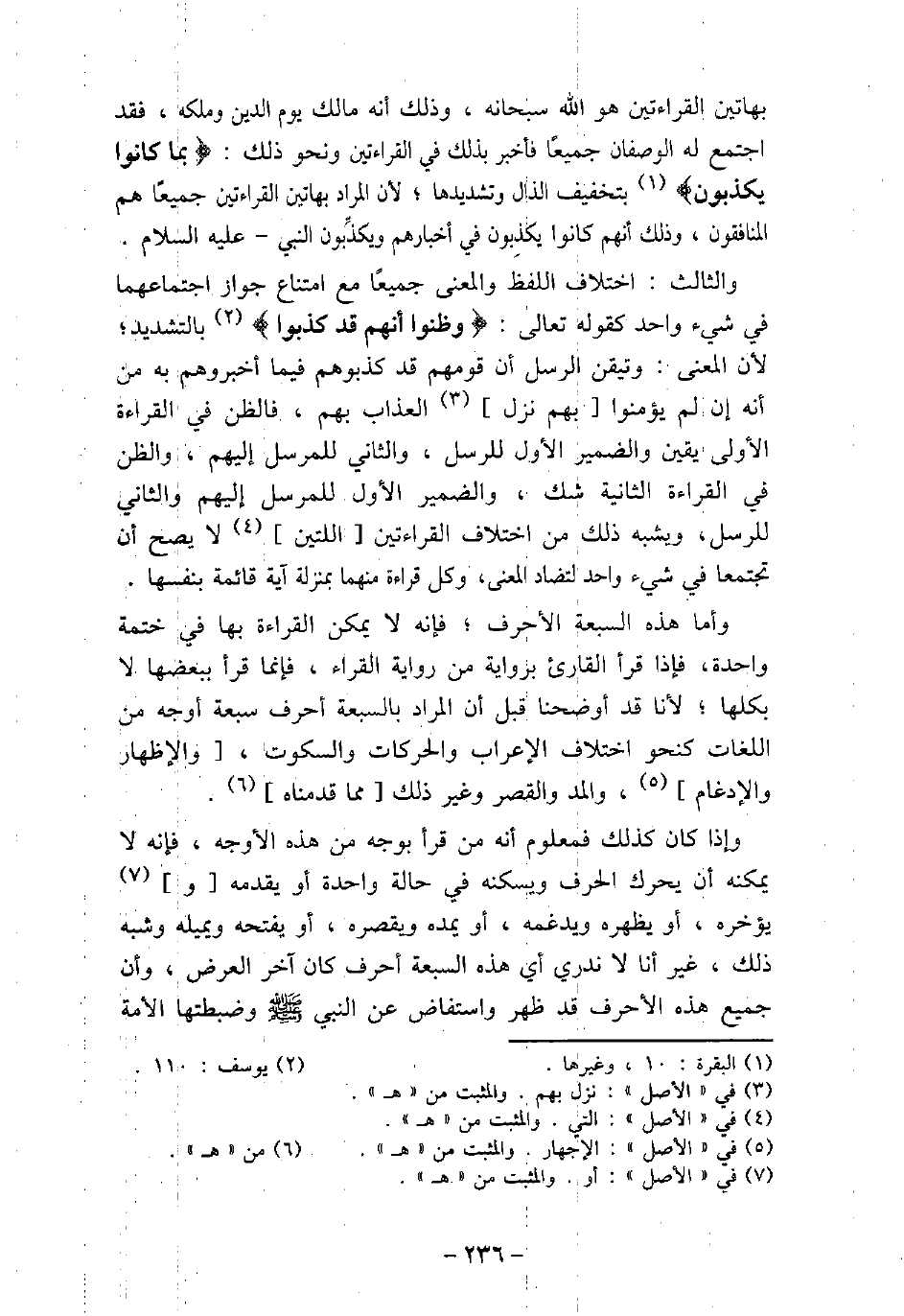 بهاتين القراءتين هو الله سبحانه، وذلك أنه مالك يوم الدين وملكه، فقد اجتمع له الوصفان جميعًا فأخبر بذلك فى القراءتين ونحو ذلك: (بِمَا كَانُوا يَكْذِبُونَ) [البقرة: 10] ، بتخفيف الذال وتشديدها؛ لأن المراد بهاتين القراءتين جميعًا هم المنافقون، وذلك أنهم كانوا يكذبِون فى أخبارهم ويكذبون النبي (صلى الله عليه وسلم) . والثالث: اختلاف اللفظ والمعنى جميعًا مع امتناع جواز اجتماعهما فى شىء واحد كقوله تعالى: (وَظَنُّوا أَنَّهُمْ قَدْ كُذِبُوا) [يوسف: 110] بالتشديد؛ لأن المعنى: وتيقن الرسل أن قومهم قد كذبوهم فيما أخبروهم به من أنه إن لم يؤمنوا بهم نزل العذاب بهم، فالظن فى القراءة الأولى يقين والضمير الأول للرسل، والثانى للمرسل إليهم، والظن فى القراءة الثانية شك، والضمير الأول للمرسل إليهم والثانى للرسل، ويشبه ذلك من اختلاف القراءتين اللتين لا يصح أن تجتمعا فى شىء واحد لتضاد المعنى، وكل قراءة منهما بمنزلة آية قائمة بنفسها. وأما هذه السبعة الأحرف؛ فإنه لا يمكن القراءة بها فى ختمة واحدة، فإذا قرأ القارئ برواية من رواية القراء، فإنما قرأ ببعضها لا بكلها؛ لأنا قد أوضحنا قبل أن المراد بالسبعة أحرف سبعة أوجه من اللغات كنحو اختلاف الإعراب والحركات والسكوت، والإظهار والإدغام، والمد والقصر وغير ذلك مما قدمناه. وإذا كان كذلك فمعلوم أنه من قرأ بوجه من هذه الأوجه، فإنه لا يمكنه أن يحرك الحرف ويسكنه فى حالة واحدة أو يقدمه ويؤخره، أو يظهره ويدغمه، أو يمده ويقصره، أو يفتحه ويمليه وشبه ذلك، غير أنا لا ندري أى هذه السبعة أحرف كان آخر العرض، وأن جميع هذه الأحرف قد ظهر واستفاض عن النبي (صلى الله عليه وسلم) وضبطتها الأمة