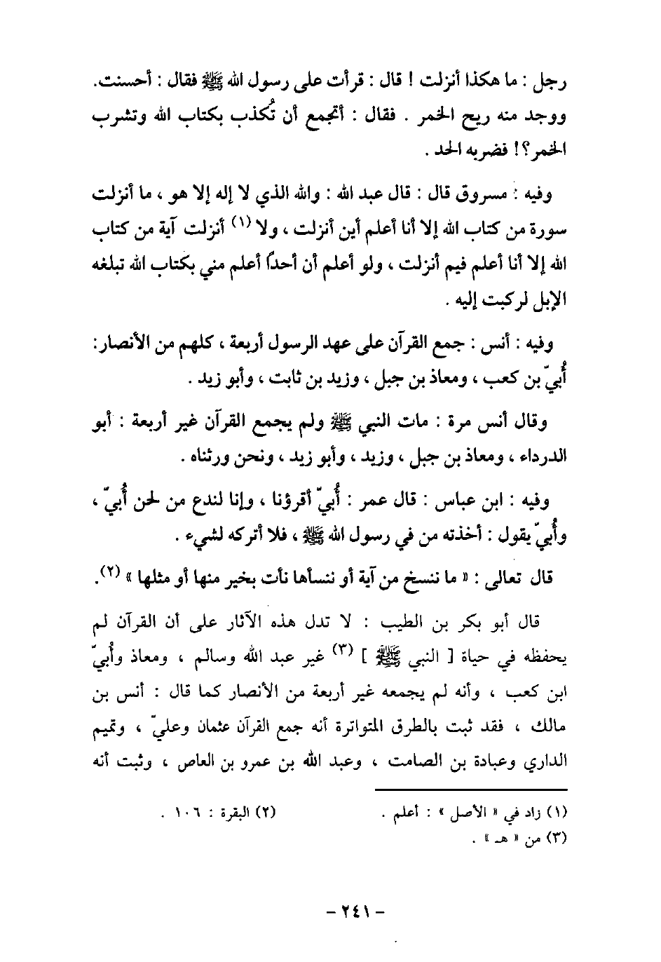 رَجُلٌ: مَا هَكَذَا أُنْزِلَتْ، قَالَ: قَرَأْتُ عَلَى رَسُولِ اللَّه (صلى الله عليه وسلم) ، فَقَالَ: (أَحْسَنْتَ) ، وَوَجَدَ مِنْهُ رِيحَ الْخَمْرِ، فَقَالَ: أَتَجْمَعُ أَنْ تُكَذِّبَ بِكِتَابِ اللَّهِ وَتَشْرَبَ الْخَمْرَ؟ فَضَرَبَهُ الْحَدَّ. / 21 - وفيه: مَسْرُوق، قَالَ: قَالَ عَبْدُاللَّهِ: وَاللَّهِ الَّذِى لا إِلَهَ غَيْرُهُ مَا أُنْزِلَتْ سُورَةٌ مِنْ كِتَابِ اللَّهِ إِلا أَنَا أَعْلَمُ، أَيْنَ أُنْزِلَتْ؟ وَلا أُنْزِلَتْ آيَةٌ مِنْ كِتَابِ اللَّهِ إِلا أَنَا أَعْلَمُ فِيمَ أُنْزِلَتْ؟ وَلَوْ أَعْلَمُ أَحَدًا أَعْلَمَ مِنِّى بِكِتَابِ اللَّهِ تُبَلِّغُهُ الإبِلُ لَرَكِبْتُ إِلَيْهِ. / 22 - وفيه: أَنَس، جَمَعَ الْقُرْآنَ عَلَى عَهْدِ الرسول (صلى الله عليه وسلم) ؟ أَرْبَعَةٌ كُلُّهُمْ مِنَ الأنْصَارِ: أُبَىُّ بْنُ كَعْبٍ، وَمُعَاذُ بْنُ جَبَلٍ، وَزَيْدُ بْنُ ثَابِتٍ، وَأَبُو زَيْدٍ. / 23 - وَقَالَ أَنَس مرة: مَاتَ النَّبِىُّ (صلى الله عليه وسلم) وَلَمْ يَجْمَعِ الْقُرْآنَ غَيْرُ أَرْبَعَةٍ: أَبُو الدَّرْدَاءِ، وَمُعَاذُ بْنُ جَبَلٍ، وَزَيْدُ بْنُ ثَابِتٍ، وَأَبُو زَيْدٍ. وَنَحْنُ وَرِثْنَاهُ. / 24 - وفيه: ابْن عَبَّاس، قَالَ عُمَرُ: أُبَىٌّ أَقْرَؤُنَا، وَإِنَّا لَنَدَعُ مِنْ لَحَنِ أُبَىٍّ، وَأُبَىٌّ يَقُولُ: أَخَذْتُهُ مِنْ فِى رَسُولِ اللَّهِ (صلى الله عليه وسلم) فَلا أَتْرُكُهُ لِشَىْءٍ. قَالَ تَعَالَى: (مَا نَنْسَخْ مِنْ آيَةٍ أَوْ نُنْسِهَا نَأْتِ بِخَيْرٍ مِنْهَا أَوْ مِثْلِهَا) [البقرة 106] . قال أبو بكر بن الطيب: لا تدل هذه الآثار على أن القرآن لم يحفظه فى حياة النبى (صلى الله عليه وسلم) غير عبد الله وسالم، ومعاذ وأُبىّ ابن كعب، وأنه لم يجمعه غير أربعة من الأنصار كما قال أنس بن مالك، فقد ثبت بالطرق المتواترة أنه جمع القرآن عثمان وعلىّ، وتميم الدارى وعبادة بن الصامت، وعبد الله بن عمرو بن العاص، وثبت أنه