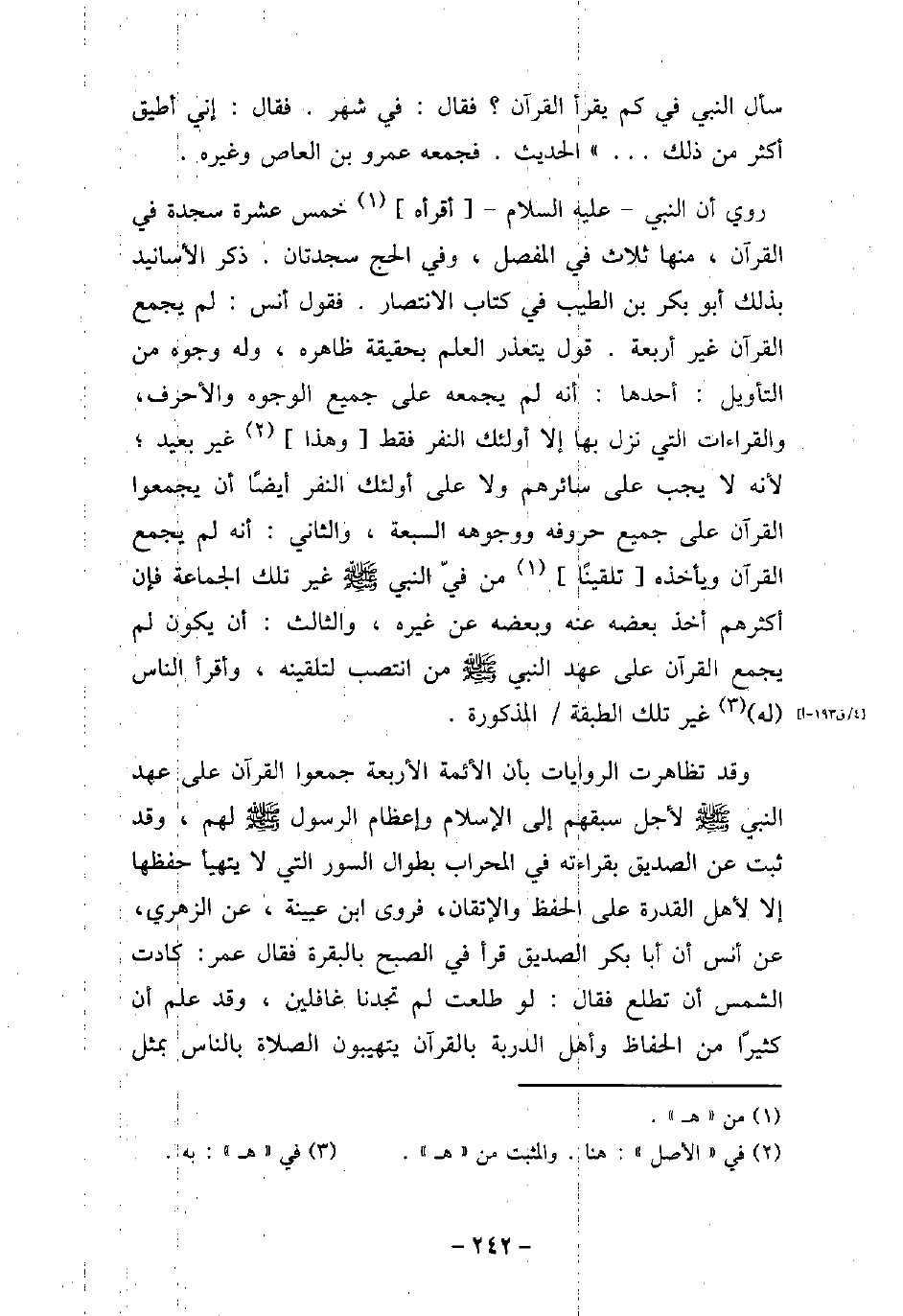 سأل النبي في كم يقرأ القرآن؟ فقال: في شهر. فقال: إني أطيق أكثر من ذلك. .) الحديث. فجمعه عمرو بن العاص وغيره. روى أن النبى (صلى الله عليه وسلم) أقرأ خمس عشرة سجدة فى القرآن، منها ثلاث فى المفصل، وفى الحج سجدتان. ذكر الأسانيد بذلك أبو بكر بن الطيب فى كتاب الانتصار. فقول أنس: لم يجمع القرآن غير أربعة. قول يتعذر العلم بحقيقة ظاهره، وله وجوه من التأويل: أحدها: أنه لم يجمعه على جميع الوجوه والأحرف، والقراءات التى نزل بها إلا أولئك النفر فقط وهذا غير بعيد؛ لأنه لا يجب على سائرهم ولا على أولئك النفر أيضًا أن يجمعوا القرآن على جميع حروفه ووجوهه السبعة، والثانى: أنه لم يجمع القرآن ويأخذه تلقينًا من فىّ النبى (صلى الله عليه وسلم) غير تلك الجماعة فإن أكثرهم أخذ بعضه عنه وبعضه عن غيره، والثالث: أن يكون لم يجمع القرآن على عهد النبى من انتصب لتلقينه، وأقرأ الناس له غير تلك الطبقة المذكورة. وقد تظاهرت الروايات بأن الأئمة الأربعة جمعوا القرآن على عهد النبى (صلى الله عليه وسلم) لأجل سبقهم إلى الإسلام وإعظام الرسول (صلى الله عليه وسلم) لهم، وقد ثبت عن الصديق بقراءته فى المحراب بطوال السور التى لا يتهيأ حفظها إلا لأهل القدرة على الحفظ والإتقان، فروى ابن عيينة، عن الزهرى، عن أنس أن أبا بكر الصديق قرأ فى الصبح بالبقرة فقال عمر: كادت الشمس أن تطلع فقال: لو طلعت لم تجدنا غافلين، وقد علم أن كثيرًا من الحفاظ وأهل الدربة بالقرآن يتهيبون الصلاة بالناس بمثل