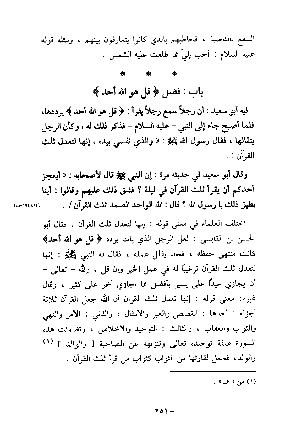 / 31 - فيه: أَبُو سَعِيد، أَنَّ رَجُلا سَمِعَ رَجُلا يَقْرَأُ: (قُلْ هُوَ اللَّهُ أَحَدٌ) [الإخلاص: 1] يُرَدِّدُهَا، فَلَمَّا أَصْبَحَ جَاءَ إِلَى النَّبِىّ (صلى الله عليه وسلم) فَذَكَرَ ذَلِكَ لَهُ، وَكَأَنَّ الرَّجُلَ يَتَقَالُّهَا، فَقَالَ رَسُولُ اللَّهِ (صلى الله عليه وسلم) : (وَالَّذِى نَفْسِى بِيَدِهِ، إِنَّهَا لَتَعْدِلُ ثُلُثَ الْقُرْآنِ) . / 32 - وَقَالَ أَبُو سَعِيد فِى حديثه مرة: إن النَّبِىُّ (صلى الله عليه وسلم) لأصْحَابِهِ: (أَيَعْجِزُ أَحَدُكُمْ أَنْ يَقْرَأَ ثُلُثَ الْقُرْآنِ فِى لَيْلَةٍ) ؟ فَشَقَّ ذَلِكَ عَلَيْهِمْ، وَقَالُوا: أَيُّنَا يُطِيقُ ذَلِكَ يَا رَسُولَ اللَّهِ؟ فَقَالَ: (اللَّهُ الْوَاحِدُ الصَّمَدُ ثُلُثُ الْقُرْآنِ) . اختلف العلماء فى معنى قوله: إنها تعدل ثلث القرآن، فقال أبو الحسن بن القابسى: لعل الرجل الذى بات يردد) قُلْ هُوَ اللَّهُ أَحَدٌ) [الإخلاص: 1] كانت منتهى حفظه، فجاء يقلل عمله، فقال له النبى (صلى الله عليه وسلم) : إنها لتعدل ثلث القرآن ترغيبًا له فى عمل الخير وإن قل، ولله تعالى أن يجازى عبدًا على يسير بأفضل مما يجازى آخر على كثير، وقال غيره: معنى قوله: إنها تعدل ثلث القرآن أن الله جعل القرآن ثلاثة أجزاء: أحدها: القصص والعبر والأمثال، والثانى: الأمر والنهى والثواب والعقاب، والثالث: التوحيد والإخلاص، وتضمنت هذه السورة صفة توحيده تعالى وتنزيهه عن الصاحبة والوالد والولد، فجعل لقارئها من الثواب كثواب من قرأ ثلث القرآن.