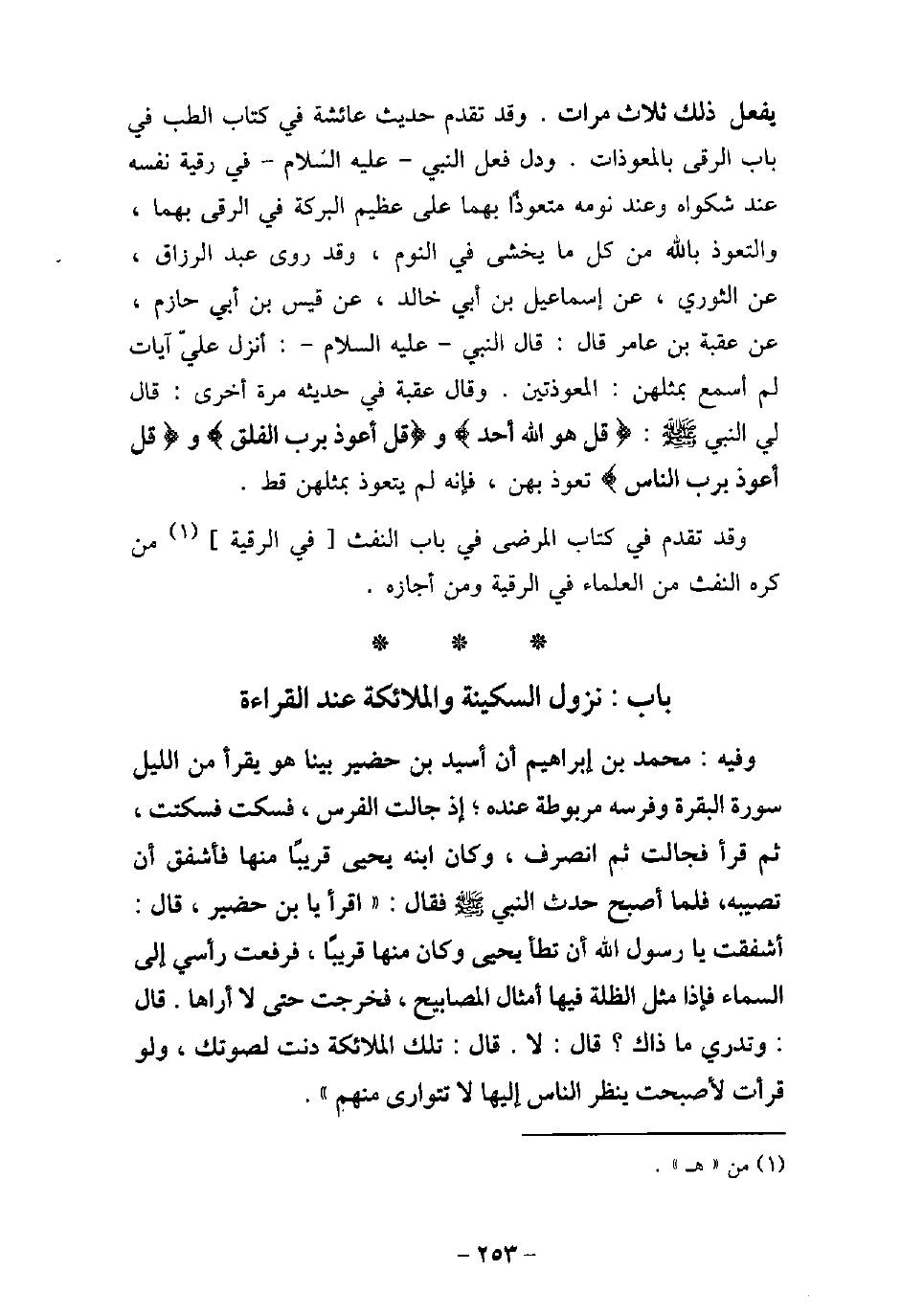 / 35 - وفيه: مُحَمَّدِ بْنِ إِبْرَاهِيمَ، أن أُسَيْدِ بْنِ حُضَيْرٍ، بَيْنَا هُوَ يَقْرَأُ مِنَ اللَّيْلِ سُورَةَ الْبَقَرَةِ وَفَرَسُهُ مَرْبُوطَةٌ عِنْدَهُ؛ إِذْ جَالَتِ الْفَرَسُ، فَسَكَتَ فَسَكَتَتْ، ثُمَّ قَرَأَ، فَجَالَتِ الْفَرَسُ، ثُمَّ انْصَرَفَ، وَكَانَ ابْنُهُ يَحْيَى قَرِيبًا مِنْهَا، فَأَشْفَقَ أَنْ تُصِيبَهُ، فَلَمَّا أَصْبَحَ حَدَّثَ النَّبِىَّ (صلى الله عليه وسلم) ، فَقَالَ: (اقْرَأْ يَا ابْنَ حُضَيْرٍ) ، قَالَ: فَأَشْفَقْتُ، يَا رَسُولَ اللَّهِ، أَنْ تَطَأَ يَحْيَى، وَكَانَ مِنْهَا قَرِيبًا، فَرَفَعْتُ رَأْسِى، فَانْصَرَفْتُ إِلَيْهِ، فَرَفَعْتُ رَأْسِى إِلَى السَّمَاءِ، فَإِذَا مِثْلُ الظُّلَّةِ فِيهَا أَمْثَالُ الْمَصَابِيحِ، فَخَرَجَتْ حَتَّى لا أَرَاهَا، قَالَ: (وَتَدْرِى مَا ذَاكَ) ؟ قَالَ: لا، قَالَ: (تِلْكَ الْمَلائِكَةُ دَنَتْ لِصَوْتِكَ، وَلَوْ قَرَأْتَ لأصْبَحَتْ يَنْظُرُ النَّاسُ إِلَيْهَا لا تَتَوَارَى مِنْهُمْ) .