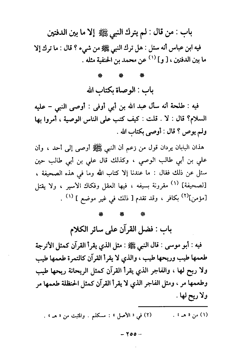 / 37 - فيه: طَلْحَةُ، أَنَّهُ سَأَل عَبْدَاللَّهِ بْنَ أَبِى أَوْفَى: آوْصَى النَّبِىُّ (صلى الله عليه وسلم) ؟ فَقَالَ: لا، قُلْتُ: كَيْفَ كُتِبَ عَلَى النَّاسِ الْوَصِيَّةُ؟ أُمِرُوا بِهَا وَلَمْ يُوصِ، قَالَ: (أَوْصَى بِكِتَابِ اللَّهِ) . هذان البابان يردان قول من زعم أن النبى (صلى الله عليه وسلم) أوصى إلى أحد، وأن على بن أبى طالب الوصى، وكذلك قال على بن أبى طالب حين سئل عن ذلك فقال: ما عندنا إلا كتاب الله وما فى هذه الصحيفة، الصحيفة مقرونة بسيفه، فيها العقل وفكاك الأسير، ولا يقتل مؤمن بكافر، وقد تقدم ذلك فى غير موضع.