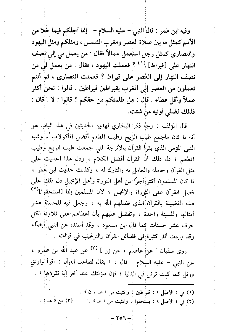 وَمَثَلُ الْفَاجِرِ الَّذِي يَقْرَأُ الْقُرْآنَ كَمَثَلِ الرَّيْحَانَةِ رِيحُهَا طَيِّبٌ وَطَعْمُهَا مُرٌّ، وَمَثَلُ الْفَاجِرِ الَّذِي لا يَقْرَأُ الْقُرْآنَ كَمَثَلِ الْحَنْظَلَةِ، طَعْمُهَا مُرٌّ وَلا رِيحَ لَهَا) . / 39 - وفيه: ابْن عُمَرَ، قَالَ النَّبِىّ (صلى الله عليه وسلم) : (إِنَّمَا أَجَلُكُمْ فِيما خَلا مِنَ الأمَمِ كمثل مَا بَيْنَ صَلاةِ الْعَصْرِ وَمَغْرِبِ الشَّمْسِ، وَمَثَلُكُمْ وَمَثَلُ الْيَهُودِ وَالنَّصَارَى كَمَثَلِ رَجُلٍ اسْتَعْمَلَ عُمَّالا، فَقَالَ: مَنْ يَعْمَلُ لِى إِلَى نِصْفِ النَّهَارِ عَلَى قِيرَاطٍ؟ فَعَمِلَتِ الْيَهُودُ، فَقَالَ: مَنْ يَعْمَلُ لِى مِنْ نِصْفِ النَّهَارِ إِلَى الْعَصْرِ، عَلَى قِيرَاطٍ؟ فَعَمِلَتِ النَّصَارَى، ثُمَّ أَنْتُمْ تَعْمَلُونَ مِنَ الْعَصْرِ إِلَى الْمَغْرِبِ بِقِيرَاطَيْنِ قِيرَاطَيْنِ، قَالُوا: نَحْنُ أَكْثَرُ عَمَلا، وَأَقَلُّ عَطَاءً، قَالَ: هَلْ ظَلَمْتُكُمْ مِنْ حَقِّكُمْ؟ قَالُوا: لا، قَالَ: فَذَاكَ فَضْلِى أُوتِيهِ مَنْ شِئْتُ) . قال المؤلف: وجه ذكر البخارى لهذين الحديثين فى هذا الباب هو أنه لما كان ما جمع طيب الريح وطيب المطعم أفضل المأكولات، وشبه النبى المؤمن الذى يقرأ القرآن بالأترجة التى جمعت طيب الريح وطيب المطعم؛ دل ذلك أن القرآن أفضل الكلام، ودل هذا الحديث على مثل القرآن وحامله والعامل به والتارك له، وكذلك حديث ابن عمر، لما كان المسلمون أكثر أجرًا من أهل التوراة وأهل الإنجيل دل ذلك على فضل القرآن على التوراة والإنجيل؛ لأن المسلمين إنما استحقوا هذه الفضيلة بالقرآن الذى فضلهم الله به، وجعل فيه للحسنة عشر أمثالها وللسيئة واحدة، وتفضل عليهم بأن أعطاهم على تلاوته لكل حرف عشر حسنات كما قال ابن مسعود، وقد أسنده عن النبى أيضًا، وقد وردت آثار كثيرة فى فضائل القرآن والترغيب فى قراءته. روى سفيان عن عاصم، عن زر عن عبد الله بن عمرو، عن النبى (صلى الله عليه وسلم) قال: (يقال لصاحب القرآن: اقرأ وارتقِ ورتل كما كنت ترتل فى الدنيا؛ فإن منزلتك عند آخر آية تقرؤها) .