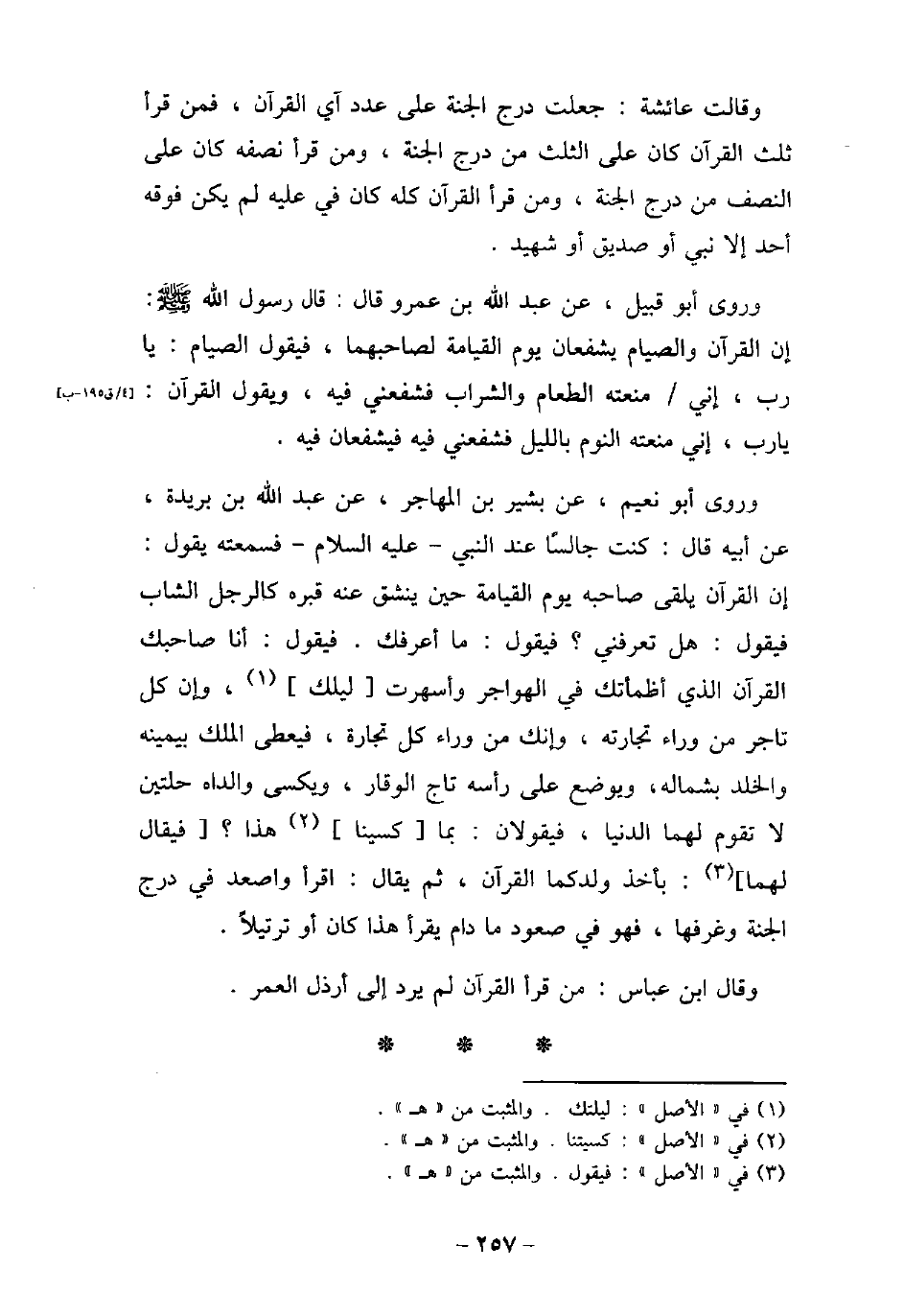 وقالت عائشة: جعلت درج الجنة على عدد آى القرآن، فمن قرأ ثلث القرآن كان على الثلث من درج الجنة، ومن قرأ نصفه كان على النصف من درج الجنة، ومن قرأ القرآن كله كان فى عاليه لم يكن فوقه أحد إلا نبى أو صديق أو شهيد. وروى أبو قبيل: عن عبد الله بن عمرو قال: قال رسول الله (صلى الله عليه وسلم) : (إن القرآن والصيام يشفعان يوم القيامة لصاحبهما، فيقول الصيام: يا رب، إنى منعته الطعام والشراب فشفعنى فيه، ويقول القرآن: يا رب، إنى منعته النوم بالليل فشفعنى فيه فيشفعان فيه) . وروى أبو نعيم، عن بشير بن المهاجر، عن عبد الله بن بريدة، عن أبيه قال: كنت جالسًا عند النبى (صلى الله عليه وسلم) فسمعته يقول: إن القرآن يلقى صاحبه يوم القيامة حين ينشق عنه قبره كالرجل الشاب فيقول: هل تعرفنى؟ فيقول: ما أعرفك. فيقول: أنا صاحبك القرآن الذى أظمأتك فى الهواجر وأسهرت ليلك، وإن كل تاجر من وراء تجارته، وإنك من وراء كل تجارة، فيعطى الملك بيمينه والخلد بشماله، ويوضع على رأسه تاج الوقار، ويكسى والداه حلتين لا تقوم لهما الدنيا، فيقولان: بما كسينا هذا؟ فيقال لهما: بأخذ ولدكما القرآن، ثم يقال: اقرأ واصعد فى درج الجنة وغرفها، فهو فى صعود ما دام يقرأ هذا كان أو ترتيلاً. وقال ابن عباس: من قرأ القرآن لم يرد إلى أرذل العمر.
