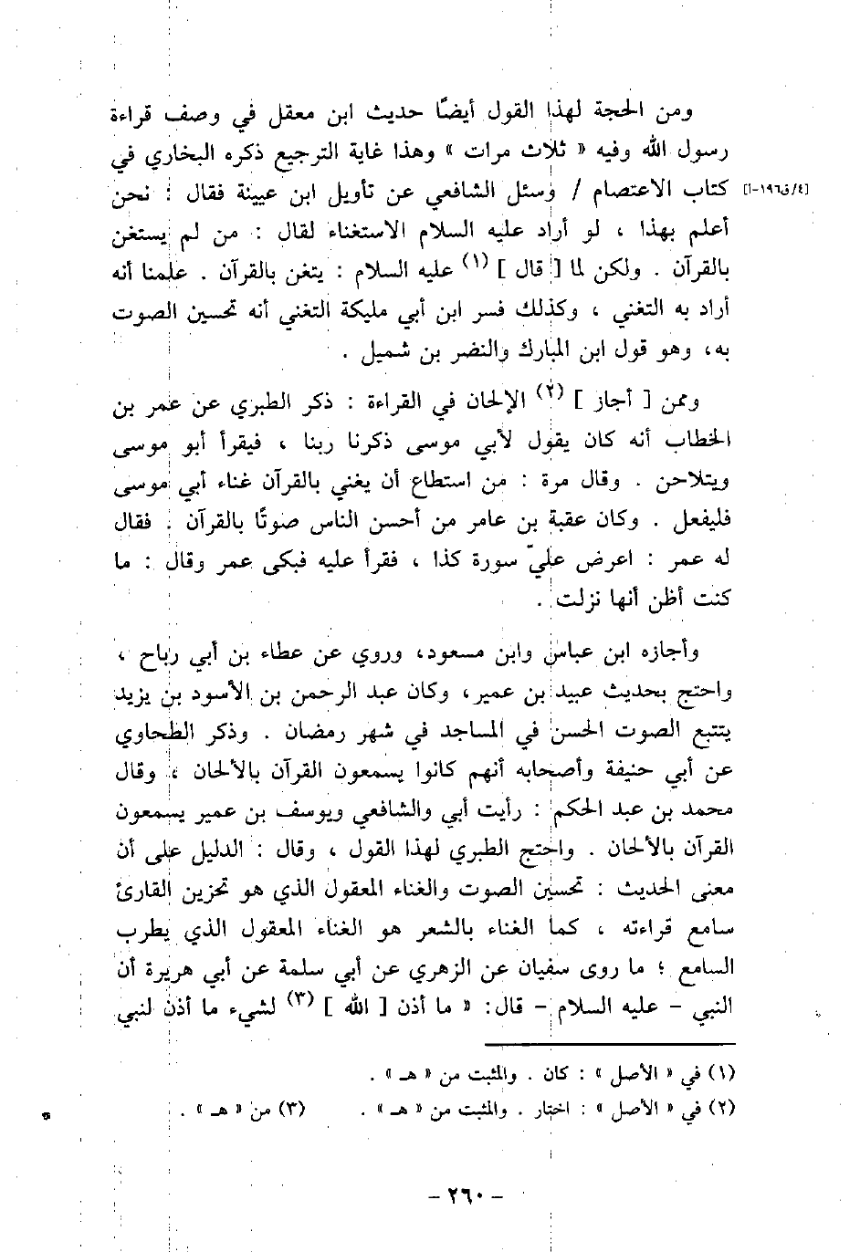 ومن الحجة لهذا القول أيضًا حديث ابن معقل فى وصف قراءة رسول الله وفيه (ثلاث مرات) وهذا غاية الترجيع ذكره البخارى فى كتاب الاعتصام وسئل الشافعى عن تأويل ابن عيينة فقال: نحن أعلم بهذا، لو أراد (صلى الله عليه وسلم) الاستغناء لقال: من لم يستغن بالقرآن. ولكن لما قال (صلى الله عليه وسلم) : يتغن بالقرآن. علمنا أنه أراد به التغنى، وكذلك فسر ابن أبى مليكة التغنى أنه تحسين الصوت به، وهو قول ابن المبارك والنضر بن شميل. وممن أجاز الإلحان فى القراءة: ذكر الطبرى عن عمر بن الخطاب أنه كان يقول لأبى موسى ذكرنا ربنا، فيقرأ أبو موسى ويتلاحن. وقال مرة: من استطاع أن يغني بالقرآن غناء أبي موسى فليفعل. وكان عقبة بن عامر من أحسن الناس صوتًا بالقرآن. فقال له عمر: اعرض علىّ سورة كذا، فقرأ عليه فبكى عمر وقال: ما كنت أظن أنها نزلت. وأجازه ابن عباس وابن مسعود، وروى عن عطاء بن أبى رباح، واحتج بحديث عبيد بن عمير، وكان عبد الرحمن بن الأسود بن يزيد يتتبع الصوت الحسن فى المساجد فى شهر رمضان. وذكر الطحاوى عن أبى حنيفة وأصحابه أنهم كانوا يسمعون القرآن بالألحان، وقال محمد بن عبد الحكم: رأيت أبى والشافعى ويوسف بن عمير يسمعون القرآن بالألحان. واحتج الطبرى لهذا القول، وقال: الدليل على أن معنى الحديث: تحسين الصوت والغناء المعقول الذى هو تحزين القارئ سامع قراءته، كما الغناء بالشعر هو الغناء المعقول الذى يطرب السامع؛ ما روى سفيان عن الزهرى عن أبى سلمة عن أبى هريرة أن النبي - عليه السلام - قال: (ما أذن الله لشىء ما أذن لنبي