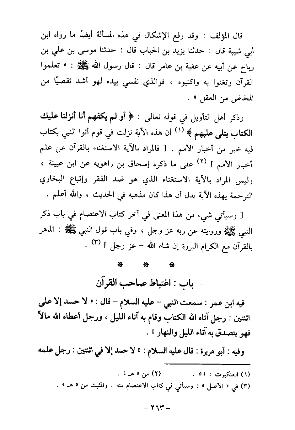 قال المؤلف: وقد رفع الإشكال فى هذه المسألة أيضًا ما رواه ابن أبى شيبة قال: حدثنا يزيد بن الحباب قال: حدثنا موسى بن على بن رباح عن أبيه عن عقبة بن عامر قال: قال رسول الله (صلى الله عليه وسلم) : (تعلموا القرآن وتغنوا به واكتبوه، فوالذى نفسى بيده لهو أشد تقصيًا من المخاض من العقل) . وذكر أهل التأويل فى قوله تعالى: (أَوَلَمْ يَكْفِهِمْ أَنَّا أَنزَلْنَا عَلَيْكَ الْكِتَابَ يُتْلَى عَلَيْهِمْ) [العنكبوت: 51] أن هذه الآية نزلت فى قوم أتوا النبى بكتاب فيه خبر من أخبار الأمم. فالمراد بالآية الاستغناء بالقرآن عن علم أخبار الأمم على ما ذكره إسحاق بن راهويه عن ابن عيينة، وليس المراد بالآية الاستغناء الذى هو ضد الفقر واتباع البخارى الترجمة بهذه الآية يدل أن هذا كان مذهبه فى الحديث، والله أعلم. وسيأتى شىء من هذا المعنى فى آخر كتاب الاعتصام فى باب ذكر النبى (صلى الله عليه وسلم) وروايته عن ربه عز وجل، وفى باب قول النبى (صلى الله عليه وسلم) : (الماهر بالقرآن مع الكرام البررة، إن شاء الله، عز وجل) .