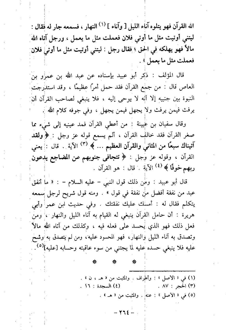 اللَّهُ الْقُرْآنَ، فَهُوَ يَتْلُوهُ آنَاءَ اللَّيْلِ وَآنَاءَ النَّهَارِ، فَسَمِعَهُ جَارٌ لَهُ، فَقَالَ: لَيْتَنِى أُوتِيتُ مِثْلَ مَا أُوتِىَ فُلانٌ، فَعَمِلْتُ مِثْلَ مَا يَعْمَلُ، وَرَجُلٌ آتَاهُ اللَّهُ مَالا، فَهُوَ يُهْلِكُهُ فِى الْحَقِّ، فَقَالَ رَجُلٌ: لَيْتَنِى أُوتِيتُ مِثْلَ مَا أُوتِىَ فُلانٌ، فَعَمِلْتُ مِثْلَ مَا يَعْمَلُ) . قال المؤلف: ذكر أبو عبيد بإسناده عن عبد الله بن عمر بن العاص قال: من جمع القرآن فقد حمل أمرًا عظيمًا، وقد استدرجت النبوة بين جنبيه إلا أنه لا يوحى إليه، فلا ينبغى لصاحب القرآن أن يرفث فيمن يرفث ولا يجهل فيمن يجهل، وفى جوفه كلام الله. وقال سفيان بن عيينة: من أعطى القرآن فمد عينيه إلى شىء ما صغر القرآن فقد خالف القرآن، ألم يسمع قوله عز وجل: (وَلَقَدْ آتَيْنَاكَ سَبْعًا مِّنَ الْمَثَانِى وَالْقُرْآنَ الْعَظِيمَ) [الحجر: 87] الآية. قال: يعنى القرآن، وقوله عز وجل: (تَتَجَافَى جُنُوبُهُمْ عَنِ الْمَضَاجِعِ يَدْعُونَ رَبَّهُمْ خَوْفًا) [السجدة: 16] الآية. قال: هو القرآن. قال أبو عبيد: ومن ذلك قول النبى (صلى الله عليه وسلم) : (ما أنفق عبد من نفقة أفضل من نفقة فى قول) . ومنه قول شريح لرجل سمعه يتكلم فقال له: أمسك عليك نفقتك. وفى حديث ابن عمر وأبى هريرة: أن حامل القرآن ينبغى له القيام به آناء الليل والنهار، ومن فعل ذلك فهو الذى يحسد على فعله فيه، وكذلك من آتاه الله مالاً وتصدق به آناء الليل والنهار، فهو المحسود عليه، ومن لم يتصدق به وشح عليه فلا ينبغى حسده عليه لما يجتنى من سوء عاقبته وحسابه عليه.