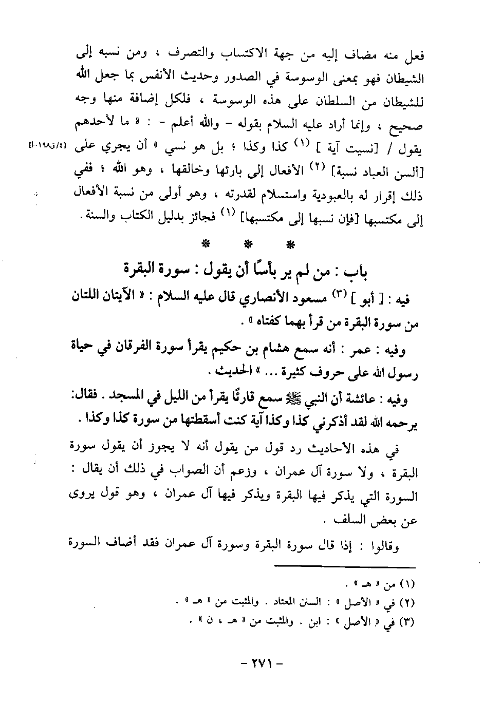 / 53 - فيه: أَبُو مَسْعُود الأنْصَارِىِّ، قال (صلى الله عليه وسلم) : (الآيَتَانِ مِنْ آخِرِ سُورَةِ الْبَقَرَةِ مَنْ قَرَأَ بِهِمَا كَفَتَاهُ) . / 54 - وفيه: عُمَرَ، أَنَّهُ سَمع هِشَامَ بْنَ حَكِيمِ، يَقْرَأُ سُورَةَ الْفُرْقَانِ فِى حَيَاةِ رَسُولِ اللَّهِ (صلى الله عليه وسلم) ، عَلَى حُرُوفٍ كَثِيرَةٍ. . . الحديث. / 55 - وفيه: عَائِشَةَ، أَنّ النَّبِىُّ (صلى الله عليه وسلم) سَمِعَ قَارِئًا يَقْرَأُ مِنَ اللَّيْلِ فِى الْمَسْجِدِ، فَقَالَ: (يَرْحَمُهُ اللَّهُ لَقَدْ أَذْكَرَنِى كَذَا وَكَذَا آيَةً، أَسْقَطْتُهَا مِنْ سُورَةِ كَذَا وَكَذَا) . فى هذه الأحاديث رد قول من يقول أنه لا يجوز أن يقول سورة البقرة، ولا سورة آل عمران، وزعم أن الصواب فى ذلك أن يقال: السورة التى يذكر فيها البقرة ويذكر فيها آل عمران، وهو قول يروى عن بعض السلف. وقالوا: إذا قال سورة البقرة وسورة آل عمران فقد أضاف السورة