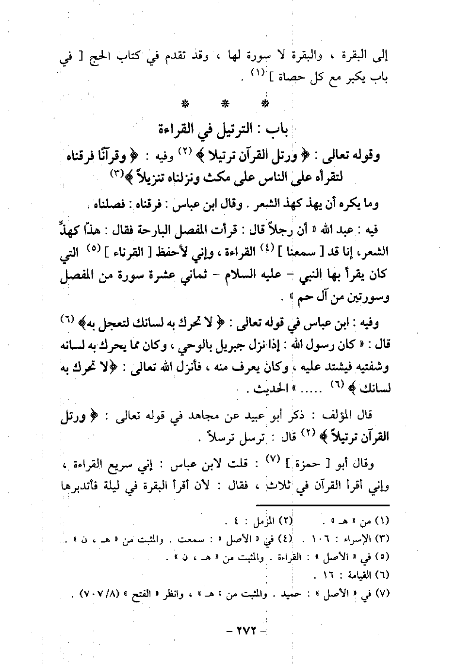 - باب التَّرْتِيلِ فِى الْقِرَاءةِ وَقَوْلِهِ تَعَالَى: (وَرَتِّلِ الْقُرْآنَ تَرْتِيلا) [المزمل: 4] ، وَقَوْلِهِ: (وَقُرْآنًا فَرَقْنَاهُ لِتَقْرَأَهُ عَلَى النَّاسِ عَلَى مُكْثٍ ونزلناه تنزيلا) [الإسراء: 106]