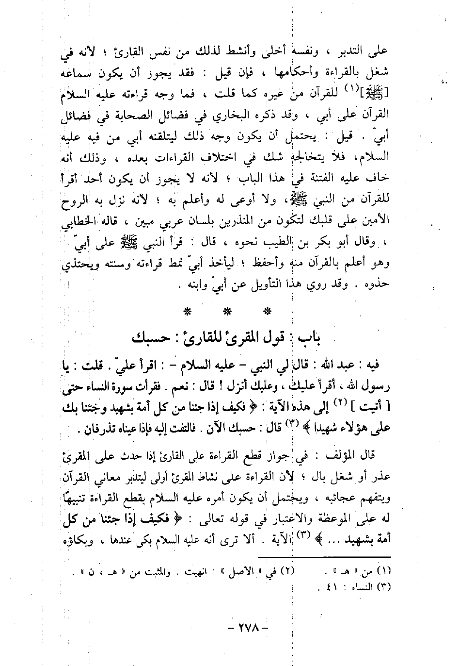 / 62 - فيه: عَبْدِ اللَّه، قال لِى النَّبِىُّ (صلى الله عليه وسلم) : (اقْرَأْ عَلَىَّ) ، قُلْتُ: يَا رَسُولَ اللَّهِ، آقْرَأُ عَلَيْكَ وَعَلَيْكَ أُنْزِلَ؟ قَالَ: (نَعَمْ) ، فَقَرَأْتُ سُورَةَ النِّسَاءِ حَتَّى أَتَيْتُ إِلَى هَذِهِ الآيَةِ: (فَكَيْفَ إِذَا جِئْنَا مِنْ كُلِّ أُمَّةٍ بِشَهِيدٍ وَجِئْنَا بِكَ عَلَى هَؤُلاءِ شَهِيدًا) [النساء: 41] قَالَ: (حَسْبُكَ الآنَ) ، فَالْتَفَتُّ إِلَيْهِ، فَإِذَا عَيْنَاهُ تَذْرِفَانِ. قال المؤلف: فى جواز قطع القراءة على القارئ إذا حدث على المقرئ عذر أو شغل بال؛ لأن القراءة على نشاط المقرئ أولى ليتدبر معانى القرآن ويتفهم عجائبه، ويحتمل أن يكون أمره (صلى الله عليه وسلم) بقطع القراءة تنبيهًا له على الموعظة والاعتبار فى قوله تعالى: (فَكَيْفَ إِذَا جِئْنَا مِنْ كُلِّ أُمَّةٍ بِشَهِيدٍ) [النساء: 41] الآية. ألا ترى أنه (صلى الله عليه وسلم) بكى عندها، وبكاؤه
