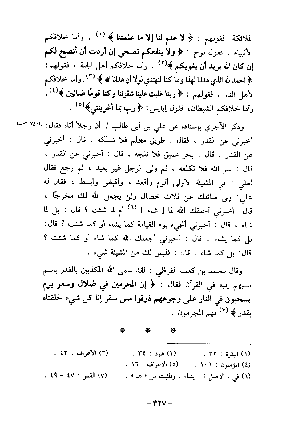 الملائكة فقولهم: (لاَ عِلْمَ لَنَا إِلاَّ مَا عَلَّمْتَنَا) [البقرة: 32] ، وأما خلافكم الأنبياء، فقول نوح: (وَلاَ يَنفَعُكُمْ نُصْحِى إِنْ أَرَدتُّ أَنْ أَنصَحَ لَكُمْ إِن كَانَ اللهُ يُرِيدُ أَن يُغْوِيَكُمْ) [هود: 34] ، وأما خلافكم أهل الجنة، فقولهم: (الْحَمْدُ لِلّهِ الَّذِى هَدَانَا لِهَذَا وَمَا كُنَّا لِنَهْتَدِىَ لَوْلا أَنْ هَدَانَا اللهُ) [الأعراب: 43] ، وأما خلافكم لأهل النار، فقولهم: (رَبَّنَا غَلَبَتْ عَلَيْنَا شِقْوَتُنَا وَكُنَّا قَوْمًا ضَالِّينَ) [المؤمنون: 106] ، وأما خلافكم الشيطان، فقول إبليس: (رَبِّ بِمَا أَغْوَيْتَنِى) [الحجر: 39] . وذكر الآجرى بإسناده عن على بن أبى طالب أن رجلاً أتاه فقال: أخبرنى عن القدر، فقال: طريق مظلم فلا تسلكه. قال: أخبرنى عن القدر. قال: بحر عميق فلا تلجه، قال: أخبرنى عن القدر، قال: سر الله فلا تكلفه، ثم ولى الرجل غير بعيد، ثم رجع فقال لعلى: فى المشيئة الأولى أقوم وأقعد، وأقبض وأبسط فقال له على: إنى سائلك عن ثلاث خصال ولن يجعل الله لك مخرجًا، قال: أخبرنى أخلقك الله لما شاء أم لما شئت؟ قال: بل لما شاء، قال: أخبرنى أتجئ يوم القيامة كما يشاء أو كما شئت؟ قال: بل كما يشاء. قال: أخبرنى أجعلك الله كما شاء أو كما شئت؟ قال: بل كما شاء. قال: فليس لك من المشيئة شىء. وقال محمد بن كعب القرظى: لقد سمى الله المكذبين بالقدر باسم نسبهم إليه فى القرآن فقال: (إِنَّ الْمُجْرِمِينَ فِى ضَلاَلٍ وَسُعُرٍ يَوْمَ يُسْحَبُونَ فِى النَّارِ عَلَى وُجُوهِهِمْ ذُوقُوا مَسَّ سَقَرَ إِنَّا كُلَّ شَىْءٍ خَلَقْنَاهُ بِقَدَرٍ) [القمر: 47 - 49] فهم المجرمون.