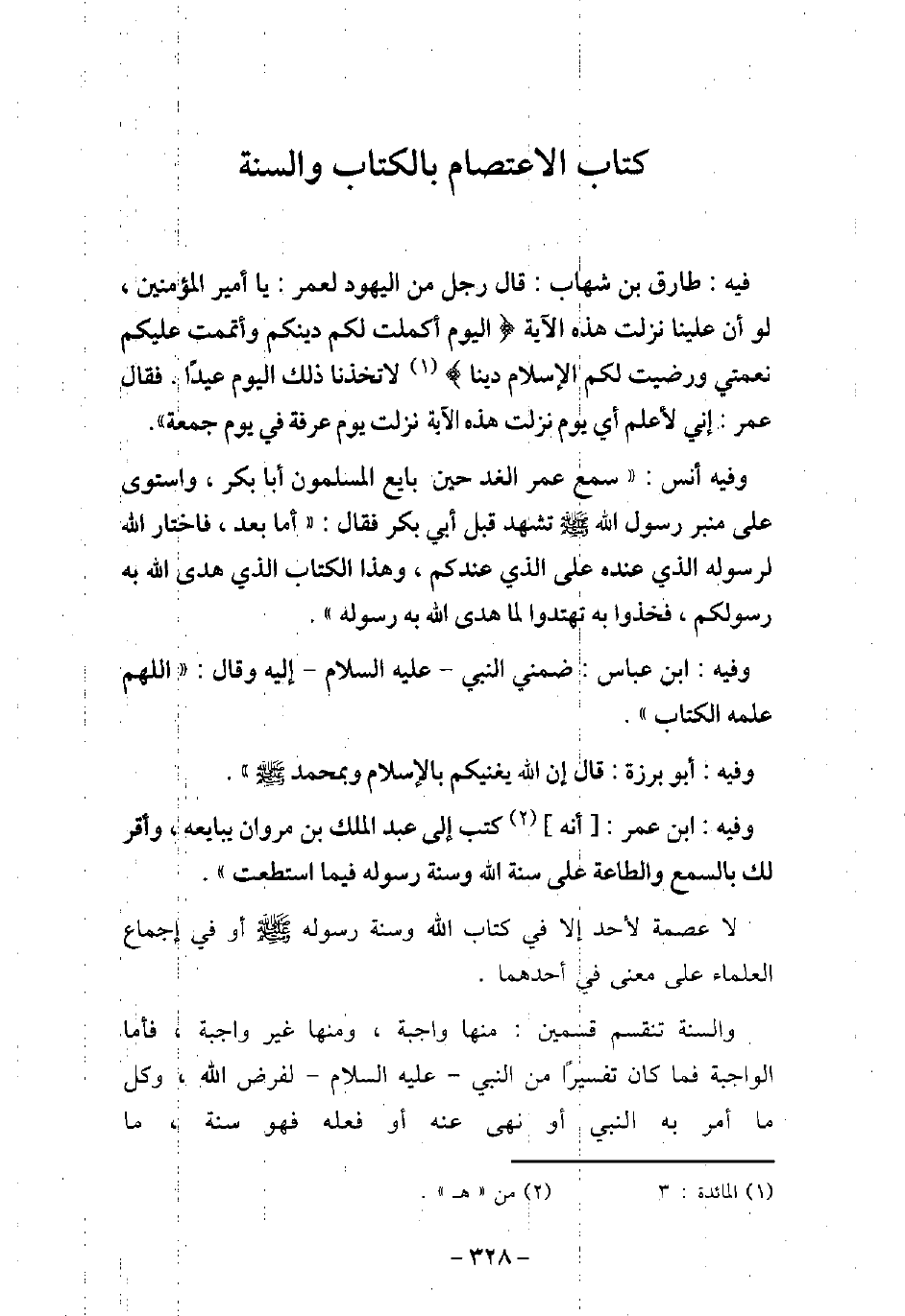 / 1 - فيه: طَارِقِ بْنِ شِهَابٍ، قَالَ رَجُلٌ مِنَ الْيَهُودِ لِعُمَرَ: يَا أَمِيرَ الْمُؤْمِنِينَ، لَوْ أَنَّ عَلَيْنَا نَزَلَتْ هَذِهِ الآيَةُ: (الْيَوْمَ أَكْمَلْتُ لَكُمْ دِينَكُمْ وَأَتْمَمْتُ عَلَيْكُمْ نِعْمَتِى وَرَضِيتُ لَكُمُ الإسْلامَ دِينًا) [المائدة: 3] لاتَّخَذْنَا ذَلِكَ الْيَوْمَ عِيدًا، فَقَالَ عُمَرُ: إِنِّى لأعْلَمُ أَىَّ يَوْمٍ نَزَلَتْ: هَذِهِ الآيَةُ نَزَلَتْ: يَوْمَ عَرَفَةَ، فِى يَوْمِ جُمُعَةٍ. / 2 - وفيه: أَنَس، سَمِعَ عُمَرَ الْغَدَ حِينَ بَايَعَ الْمُسْلِمُونَ أَبَا بَكْرٍ، وَاسْتَوَى عَلَى مِنْبَرِ رَسُولِ اللَّهِ (صلى الله عليه وسلم) ، تَشَهَّدَ قَبْلَ أَبِى بَكْرٍ، فَقَالَ: أَمَّا بَعْدُ، فَاخْتَارَ اللَّهُ لِرَسُولِهِ (صلى الله عليه وسلم) الَّذِى عِنْدَهُ عَلَى الَّذِى عِنْدَكُمْ، وَهَذَا الْكِتَابُ الَّذِى هَدَى اللَّهُ بِهِ رَسُولَكُمْ، ن فَخُذُوا بِهِ تَهْتَدُوا، وَإِنَّمَا هَدَى اللَّهُ بِهِ رَسُولَهُ. / 3 - وفيه: ابْن عَبَّاس، ضَمَّنِى النَّبِىُّ (صلى الله عليه وسلم) إِلَيْهِ وَقَالَ: (اللَّهُمَّ عَلِّمْهُ الْكِتَابَ) . / 4 - وفيه: أَبُو بَرْزَةَ، قَالَ: إِنَّ اللَّهَ يُغْنِيكُمْ بِالإسْلامِ وَبِمُحَمَّدٍ (صلى الله عليه وسلم) . / 5 - وفيه: ابْن عُمَرَ، أَنَّهُ كَتَبَ إِلَى عَبْدِالْمَلِكِ بْنِ مَرْوَانَ يُبَايِعُهُ، وَأُقِرُّ لَكَ: بِالسَّمْعِ وَالطَّاعَةِ عَلَى سُنَّةِ اللَّهِ وَسُنَّةِ رَسُولِهِ فِيمَا اسْتَطَعْتُ. لا عصمة لأحد إلا فى كتاب الله وسنة رسوله (صلى الله عليه وسلم) أو فى إجماع العلماء على معنى فى أحدهما. والسنة تنقسم قسمين: منها واجبة، ومنها غير واجبة، فأما الواجبة فما كان تفسيرًا من النبى (صلى الله عليه وسلم) لفرض الله، وكل ما أمر به النبى أو نهى عنه أو فعله فهو سنة، ما