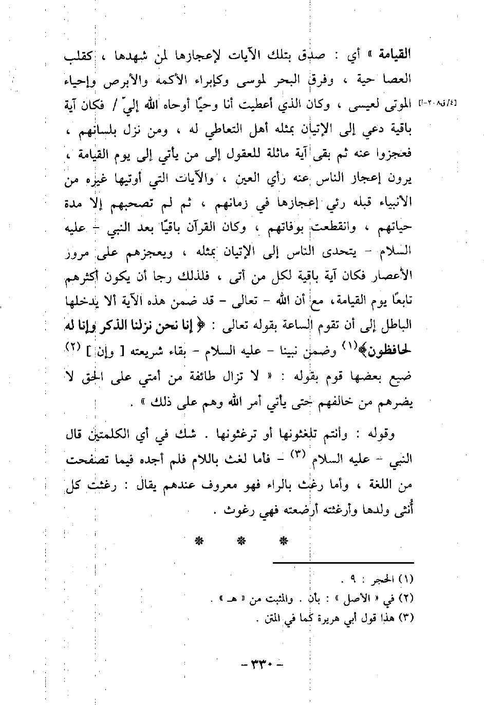 الْقِيَامَةِ) . أى: صدق بتلك الآيات لإعجازها لمن شهدها، كقلب العصا حية، وفلق البحر لموسى وكإبراء الأكمه والأبرص وإحياء الموتى لعيسى، وكان الذى أعطيت أنا وحيًا أوحاه الله إلىّ فكان آية باقية دعى إلى الإتيان بمثله أهل التعاطى له، ومن نزل بلسانهم، فعجزوا عنه ثم بقى آية ماثلة للعقول إلى من يأتى إلى يوم القيامة، يرون إعجاز الناس عنه رأى العين، والآيات التى أوتيها غيره من الأنبياء قبله رئى إعجازها فى زمانهم، ثم لم تصحبهم إلا مدة حياتهم، وانقطعت بوفاتهم، وكان القرآن باقيًا بعد النبى (صلى الله عليه وسلم) يتحدى الناس إلى الإتيان بمثله، ويعجزهم على مرور الأعصار فكان آية باقية لكل من أتى، فلذلك رجا أن يكون أكثرهم تابعًا يوم القيامة، مع أن الله تعالى قد ضمن هذه الآية ألا يدخلها الباطل إلى أن تقوم الساعة بقوله تعالى: (إِنَّا نَحْنُ نَزَّلْنَا الذِّكْرَ وَإِنَّا لَهُ لَحَافِظُونَ) [الحجر: 9] ، وضمن نبينا (صلى الله عليه وسلم) بقاء شريعته وإن ضيع بعضها قوم بقوله: (لا تزال طائفة من أمتى على الحق لا يضرهم من خالفهم حتى يأتى أمر الله وهم على ذلك) . وقوله: وأنتم تلغثونها أو ترغثونها. شك فى أى الكلمتين قال النبى (صلى الله عليه وسلم) فأما لغث باللام فلم أجده فيما تصفحت من اللغة، وأما رغث بالراء فهو معروف عندهم يقال: رغثت كل أنثى ولدها وأرغثته أرضعته فهى رغوث.