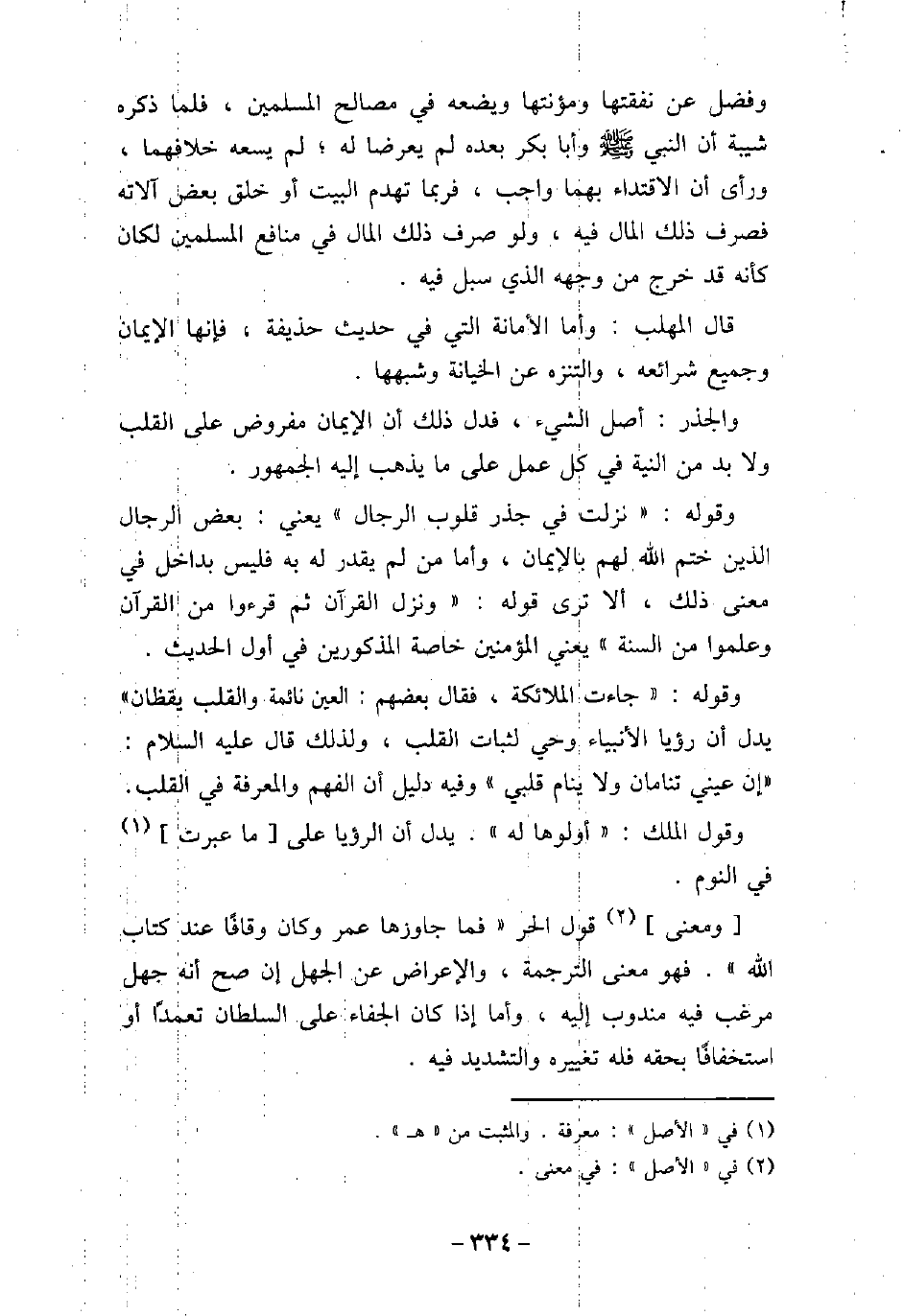وفضل عن نفقتها ومؤنتها ويضعه فى مصالح المسلمين، فلما ذكره شيبة أن النبى (صلى الله عليه وسلم) وأبا بكر بعده لم يعرضا له؛ لم يسعه خلافهما، ورأى أن الاقتداء بهما واجب، فربما تهدم البيت أو خلق بعض آلاته فصرف ذلك المال فيه، ولو صرف ذلك المال فى منافع المسلمين لكان كأنه قد خرج من وجهه الذى سبل فيه. قال المهلب: وأما الأمانة التى فى حديث حذيفة، فإنها الإيمان وجميع شرائعه، والتنزه عن الخيانة وشبهها. والجذر: أصل الشىء، فدل ذلك أن الإيمان مفروض على القلب ولابد من النية فى كل عمل ما يذهب إليه الجمهور. وقوله: (نزلت فى جذر قلوب الرجال) يعنى: بعض الرجال الذين ختم الله لهم بالإيمان، وأما من لم يقدر له به فليس بداخل فى معنى ذلك، ألا ترى قوله: (ونزل القرآن ثم قرءوا من القرآن وعلموا من السنة) يعنى المؤمنين خاصة المذكورين فى أول الحديث. وقوله: (جاءت الملائكة، فقال بعضهم: العين نائمة والقلب يقظان) يدل أن رؤيا الأنبياء وحى لثبات القلب، ولذلك قال (صلى الله عليه وسلم) : (إن عينى تنامان ولا ينام القلب) وفيه دليل أن الفهم والمعرفة فى القلب. وقول الملك: (أولوها له) . يدل أن الرؤيا على ما عبرت فى النوم. ومعنى قول الحر (فما جاوزها عمر وكان وقافًا عند كتاب الله) . فهو معنى الترجمة، والإعراض عن الجهل إن صح أنه جهل مرغب فيه مندوب إليه، وأما إذا كان الجفاء على السلطان تعمدًا أو استخفافًا بحقه فله تغييره والتشديد فيه.