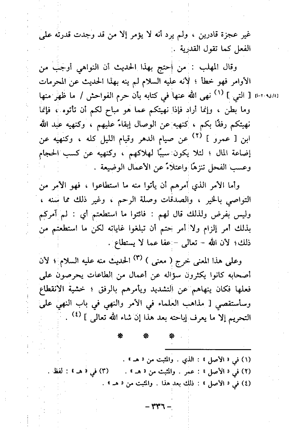 غير عجزة قادرين، ولم يرد أنه لا يؤمر إلا من قد وجدت قدرته على الفعل كما تقول القدرية. وقال المهلب: من احتج بهذا الحديث أن النواهى أوجب من الأوامر فهو خطأ؛ لأنه (صلى الله عليه وسلم) لم ينه بهذا الحديث عن المحرمات التى نهى الله عنها فى كتابه بأن حرم الفواحش ما ظهر منها وما بطن، وإنما أراد فإذا نهيتكم عما هو مباح لكم أن تأتوه، فإنما نهيتكم رفقًا بكم، كنهيه عن الوصال إبقاءً عليهم، وكنهيه عبد الله بن عمرو عن صيام الدهر وقيام الليل كله، وكنهيه عن إضاعة المال؛ لئلا يكون سببًا لهلاكهم، وكنهيه عن كسب الحجام وعسب الفحل تنزهًا واعتلاءً عن الأعمال الوضيعة. وأما الأمر الذى أمرهم أن يأتوا منه ما استطاعوا، فهو الأمر من التواصى بالخير، والصدقات وصلة الرحم، وغير ذلك مما سنه، وليس بفرض ولذلك قال لهم: فائتوا ما استطعتم أى: لم آمركم بذلك أمر إلزام ولا أمر حتم أن تبلغوا غاياته لكن ما استطعتم من ذلك؛ لأن الله تعالى عفا عما لا يستطاع. وعلى هذا المعنى خرج معنى الحديث منه (صلى الله عليه وسلم) ؛ لأن أصحابه كانوا يكثرون سؤاله عن أعماله من الطاعات يحرصون على فعلها فكان ينهاهم عن التشديد ويأمرهم بالرفق؛ خشية الانقطاع وسأتقصى مذاهب العلماء فى الأمر والنهى فى باب النهى على التحريم إلا ما يعرف إباحته بعد هذا إن شاء الله تعالى.