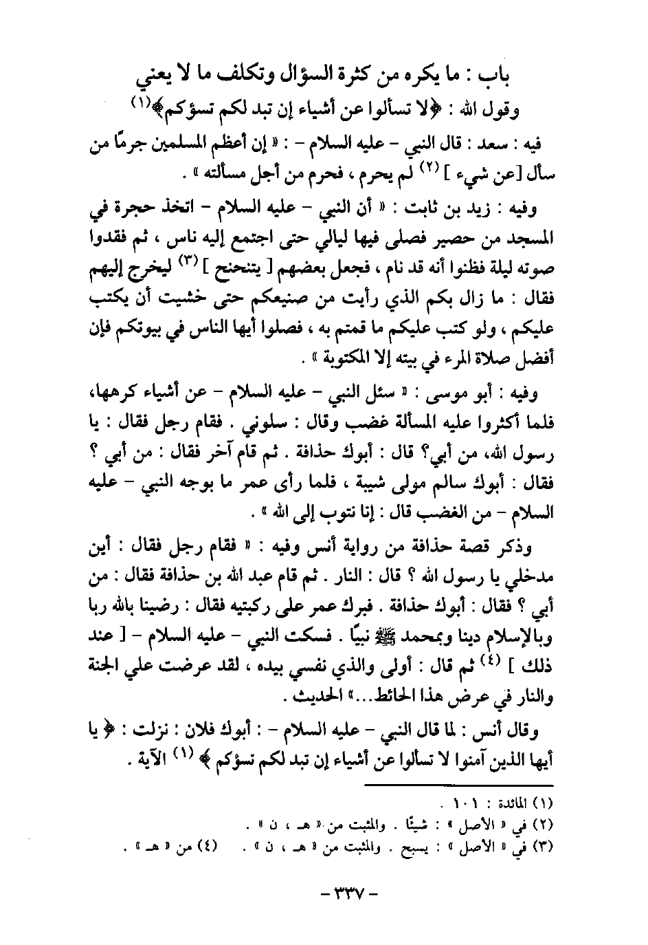 4 - باب مَا يُكْرَهُ مِنْ كَثْرَةِ السُّؤَالِ وَتَكَلُّفِ مَا لا يَعْنِي وَقوله اللَّه: (لا تَسْأَلُوا عَنْ أَشْيَاءَ إِنْ تُبْدَ لَكُمْ تَسُؤْكُمْ) [المائدة: 101]