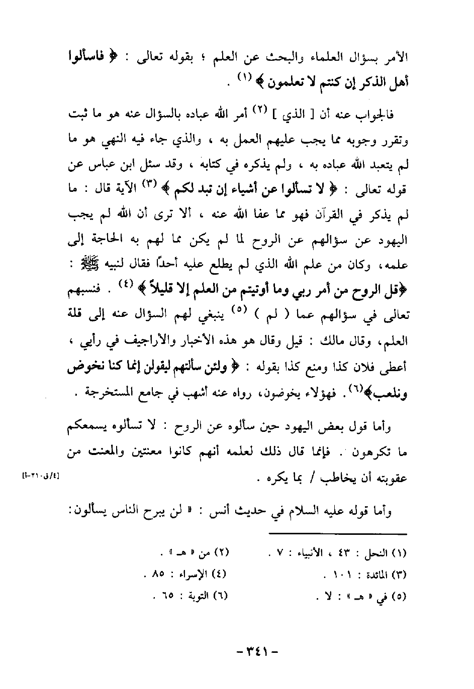 الأمر بسؤال العلماء والبحث عن العلم؛ بقوله تعالى: (فَاسْأَلُوا أَهْلَ الذِّكْرِ إِن كُنتُمْ لاَ تَعْلَمُونَ) [النحل: 43] . فالجواب عنه: أن الذى أمر الله عباده بالسؤال عنه هو ما ثبت وتقرر وجوبه مما يجب عليهم العمل به، والذى جاء فيه النهى هو ما لم يتعبد الله عباده به، ولم يذكره فى كتابه، وقد سئل ابن عباس عن قوله تعالى: (لاَ تَسْأَلُوا عَنْ أَشْيَاءَ إِنْ تُبْدَ لَكُمْ) [المائدة: 101] الآية قال: ما لم يذكر فى القرآن فهو مما عفا الله عنه، ألا ترى أن الله لم يجب اليهود عن سؤالهم عن الروح لما لم يكن مما لهم به الحاجة إلى علمه، وكان من علم الله الذى لم يطلع عليه أحدًا فقال لنبيه (صلى الله عليه وسلم) : (قُلِ الرُّوحُ مِنْ أَمْرِ رَبِّى وَمَا أُوتِيتُم مِّن الْعِلْمِ إِلاَّ قَلِيلاً) [الإسراء: 85] ، فنسبهم تعالى فى سؤالهم عما لم ينبغى لهم السؤال عنه إلى قلة العلم، وقال مالك: قيل وقال هو هذه الأخبار والأراجيف فى رأيى، أعطى فلان كذا ومنع كذا بقوله: (وَلَئِن سَأَلْتَهُمْ لَيَقُولُنَّ إِنَّمَا كُنَّا نَخُوضُ وَنَلْعَبُ) [التوبة: 65] ، فهؤلاء يخوضون، رواه عنه أشهب فى جامع المستخرجة. وأما قول بعض اليهود حين سألوه عن الروح: لا تسألوه يسمعكم ما تكرهون. فإنما قال ذلك لعلمه أنهم كانوا معنتين والمعنت من عقوبته أن يخاطب بما يكره. وأما قول (صلى الله عليه وسلم) فى حديث أنس: (لن يبرح الناس يسألون: