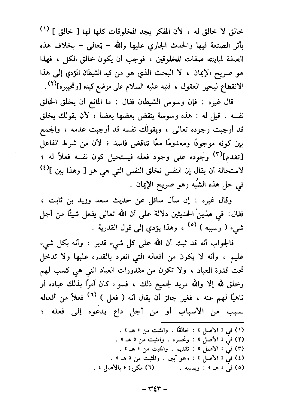 خالق لا خالق له، لأن المفكر يجد المخلوقات كلها لها خالق بأثر الصنعة فيها والحدث الجارى عليها والله تعالى بخلاف هذه الصفة لمباينته صفات المخلوقين، فوجب أن يكون خالق الكل، فهذا هو صريح الإيمان، لا البحث الذى هو من كيد الشيطان المؤدى إلى هذا الانقطاع ليحير العقول، فنبه (صلى الله عليه وسلم) على موضع كيده وتحييره. قال غيره: فإن وسوس الشيطان فقال: ما المانع أن يخلق الخالق نفسه. قيل له: هذه وسوسة ينقض بعضها بعضا؛ لأن بقولك يخلق قد أوجبت وجوده تعالى، وبقولك نفسه قد أوجبت عدمه، والجمع بين كونه موجودًا ومعدومًا معًا تناقض فاسد؛ لأن من شرط الفاعل تقدم وجوده على وجود فعله فيستحيل كون نفسه فعلاً له؛ لاستحالة أن يقال إن النفس تخلق النفس التى هى هو وهذا بين فى حل هذه الشُبه وهو صريح الإيمان. وقال غيره: إن سأل سائل عن حديث سعد وزيد بن ثابت، فقال: فى هذين الحديثين دلالة على أن الله تعالى يفعل شيئًا من أجل شىء وسببه، وهذا يؤدى إلى قول القدرية. فالجواب: أنه قد ثبت أن الله على كل شىء قدير، وأنه بكل شىء عليم، وأنه لا يكون من أفعاله التى انفرد بالقدرة عليها ولا تدخل تحت قدرة العباد، ولا تكون من مقدورات العباد التى هى كسب لهم وخلق لله إلا والله مريد لجميع ذلك، فسواء كان أمرًا بذلك عباده أو ناهيًا لهم عنه، فغير جائز أن يقال أنه فعل فعلاً من أفعاله بسبب من الأسباب أو من أجل داع يدعوه إلى فعله؛