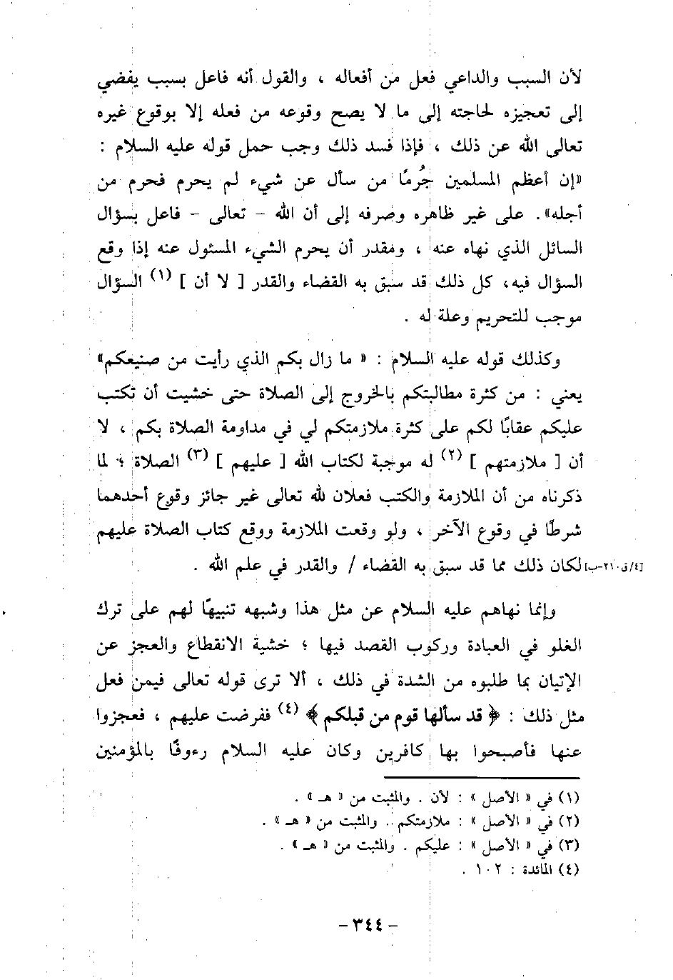 لأن السبب والداعى فعل من أفعاله، والقول أنه فاعل بسبب يقضى إلى تعجيزه لحاجته إلى ما لا يصح وقوعه من فعله إلا بوقوع غيره تعالى الله عن ذلك، فإذا فسد ذلك وجب حمل قوله (صلى الله عليه وسلم) : (إن أعظم المسلمين جُرمًا من سأل عن شىء لم يحرم فحرم من أجله) . على غير ظاهره وصرفه إلى أن الله تعالى فاعل بسؤال السائل الذى نهاه عنه، ومقدر أن يحرم الشىء المسئول عنه إذا وقع السؤال فيه، كل ذلك قد سبق به القضاء والقدر لا أن السؤال موجه للتحريم وعلة له. وكذلك قوله (صلى الله عليه وسلم) : (ما زال بكم الذى رأيت من صنيعكم) يعنى: من كثرة مطالبتكم بالخروج إلى الصلاة حتى خشيت أن تكتب عليكم عقابًا لكم على كثرة ملازمتكم لى فى مداومة الصلاة بكم، لا أن ملازمتهم له موجبة لكتاب الله عليهم الصلاة؛ لما ذكرناه من أن الملازمة والكتب فعلان لله تعالى غير جائز وقوع أحدهما شرطًا فى وقوع الآخر، ولو وقعت الملازمة ووقع كتاب الصلاة عليهم لكان ذلك مما قد سبق به القضاء والقدر فى علم الله. وإنما نهاهم، عليه السلام، عن مثل هذا وشبهه تنبيهًا لهم على ترك الغلو فى العبادة وركوب القصد فيها؛ خشية الانقطاع والعجز عن الإتيان بما طلبوه من الشدة فى ذلك، ألا ترى قوله تعالى فيمن فعل مثل ذلك: (قَدْ سَأَلَهَا قَوْمٌ مِّن قَبْلِكُمْ) [المائدة: 102] ، ففرضت عليهم، فعجزوا عنها فأصبحوا بها كافرين وكان (صلى الله عليه وسلم) رءوفًا بالمؤمنين