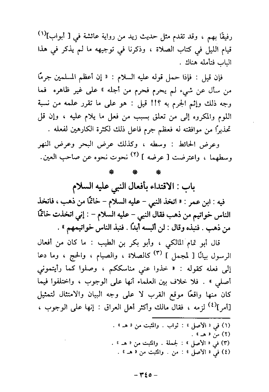 / 26 - فيه: ابْن عُمَر، اتَّخَذَ النَّبِىُّ (صلى الله عليه وسلم) خَاتَمًا مِنْ ذَهَبٍ، فَاتَّخَذَ النَّاسُ خَوَاتِيمَ مِنْ ذَهَبٍ، فَقَالَ النَّبِىُّ (صلى الله عليه وسلم) : (إِنِّى اتَّخَذْتُ خَاتَمًا مِنْ ذَهَبٍ فَنَبَذَهُ) ، وَقَالَ: (إِنِّى لَنْ أَلْبَسَهُ أَبَدًا) ، فَنَبَذَ النَّاسُ خَوَاتِيمَهُمْ. قال أبو تمام المالكى، وأبو بكر بن الطيب: ما كان من أفعال الرسول بيانًا لمجمل كالصلاة، والصيام، والحج، وما دعا إلى فعله كقوله: (خذوا عنى مناسككم، وصلوا كما رأيتمونى أصلى) . فلا خلاف بين العلماء أنها على الوجوب، واختلفوا فيما كان منها واقعًا موقع القرب لا على وجه البيان والامتثال لتمثيل أمر لزمه، فقال مالك وأكثر أهل العراق: إنها على الوجوب،