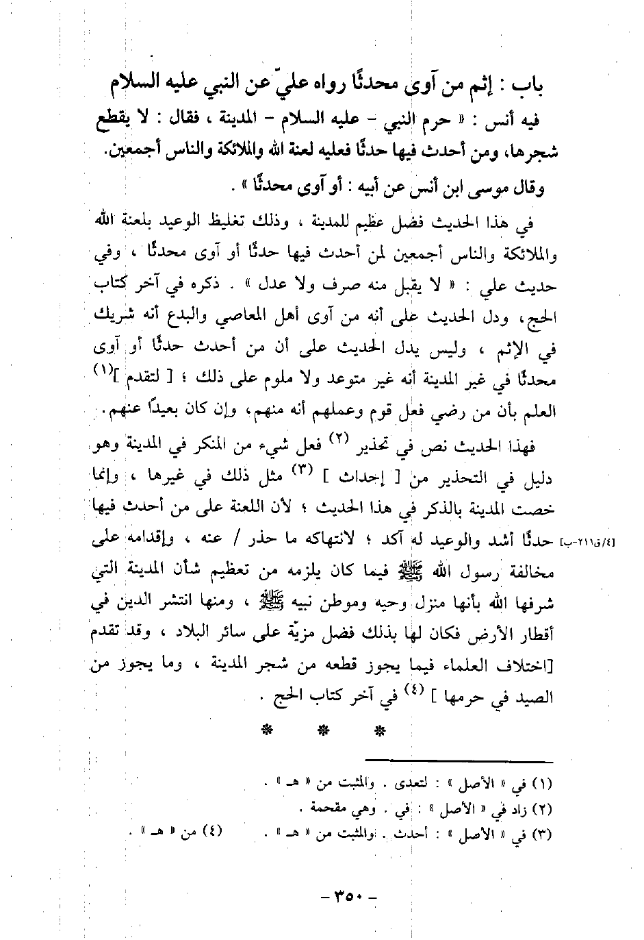 . / 33 - فيه: أَنَس، حَرَّم النَّبِىّ (صلى الله عليه وسلم) الْمَدِينَةَ؟ فقَالَ: لا يُقْطَعُ شَجَرُهَا، وَمَنْ أَحْدَثَ فِيهَا حَدَثًا فَعَلَيْهِ لَعْنَةُ اللَّهِ وَالْمَلائِكَةِ وَالنَّاسِ أَجْمَعِينَ. وَقَالَ مُوسَى بْنُ أَنَسٍ، عن أبيه: أَوْ آوَى مُحْدِثًا. فى هذا الحديث فضل عظيم للمدينة، وذلك تغليظ الوعيد بلعنة الله والملائكة والناس أجمعين لمن أحدث فيها حدثًا أو آوى محدثًا، وفى حديث على: (لا يقبل منه صرف ولا عدل) . ذكره فى آخر كتاب الحج، ودل الحديث على أنه من آوى أهل المعاصى والبدع أنه شريك فى الأثم، وليس يدل الحديث على أن من أحدث حدثًا أو آوى محدثًا فى غير المدينة أنه غير متوعد ولا ملوم على ذلك؛ لتقدم العلم بأن من رضى فعل قوم وعملهم أنه منهم، وإن كان بعيدًا عنهم. فهذا الحديث نص فى تحذير فعل شىء من المنكر فى المدينة وهو دليل فى التحذير من إحداث مثل ذلك فى غيرها، وإنما خصت المدينة بالذكر فى هذا الحديث؛ لأن اللعنة على من أحدث فيها حدثًا أشد والوعيد له آكد؛ لانتهاكه ما حذر عنه، وإقدامه على مخالفة رسول الله (صلى الله عليه وسلم) فيما كان يلزمه من تعظيم شأن المدينة التى شرفها الله بأنها منزل وحيه وموطن نبيه (صلى الله عليه وسلم) ، ومنها انتشر الدين فى أقطار الأرض فكان لها بذلك فضل مزيّة على سائر البلاد، وقد تقدم اختلاف العلماء فيما يجوز قطعه من شجر المدينة، وما يجوز من الصيد فى حرمها فى آخر كتاب الحج.