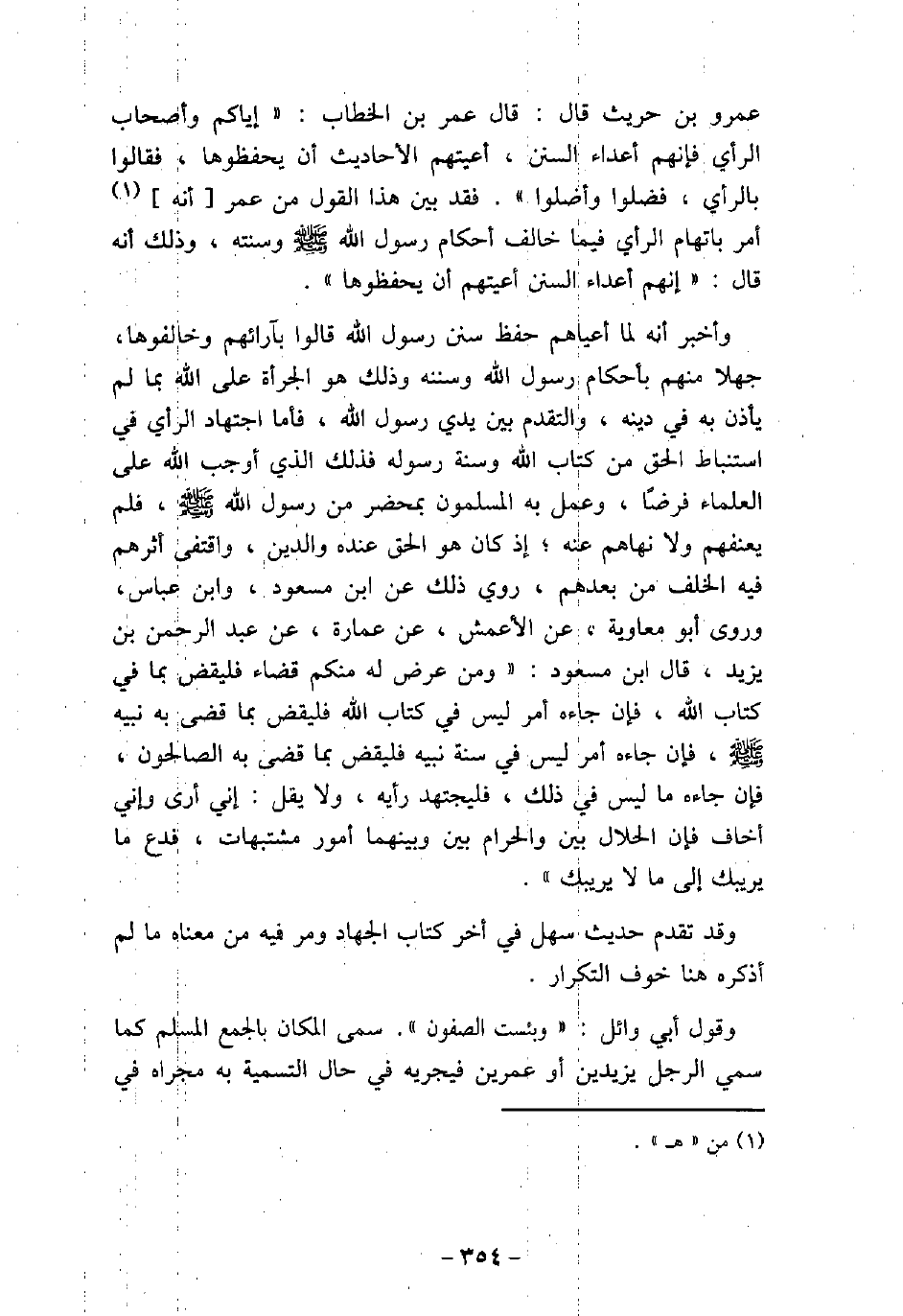 عمرو بن حريث قال: قال عمر بن الخطاب: (إياكم وأصحاب الرأى فإنهم أعداء السنن، أعيتهم الأحاديث أن يحفظوها، فقالوا بالرأى، فضلوا وأضلوا) . فقد بين هذا القول من عمر أنه أمر باتهام الرأى فيما خالف أحكام رسول الله (صلى الله عليه وسلم) وسنته، وذلك أنه قال: (إنهم أعداء السنن أعيتهم أن يحفظوها) . وأخبر أنه لما أعياهم حفظ سنن رسول الله قالوا بآرائهم وخالفوها، جهلا منهم بأحكام رسول الله وسننه وذلك هو الجرأة على الله بما لم يأذن به فى دينه، والتقدم بين يدى رسول الله، فأما اجتهاد الرأى فى استنباط الحق من كتاب الله وسنة رسوله فذلك الذى أوجب الله على العلماء فرضًا، وعمل به المسلمون بمحضر من رسول الله (صلى الله عليه وسلم) ، فلم يعنفهم ولا نهاهم عنه؛ إذ كان هو الحق عنده والدين، واقتفى أثرهم فيه الخلف من بعدهم، روى ذلك عن ابن مسعود، وابن عباس، وروى أبو معاوية، عن الأعمش، عن عمارة، عن عبد الرحمن بن يزيد، قال ابن مسعود: (ومن عرض له منكم قضاء بما فى كتاب الله، فإن جاء أمرًا ليس فى كتاب الله فليقض بما قضى به نبيه (صلى الله عليه وسلم) ، فإن جاءه أمر ليس فى سنة نبيه فليقض بما قضى به الصالحون، فإن جاءه ما ليس فى ذلك، فليجتهد رأيه، ولا يقل: إنى أرى وإنى أخاف فإن الحلال بين والحرام بين وبينهما أمور مشتبهات، فدع ما يريبك إلى ما لا يريبك) . وقد تقدم حديث سهل فى أخر كتاب الجهاد ومر فيه من معناه ما لم أذكره هنا خوف التكرار. وقول أبى وائل: (وبئست الصفون) . سمى المكان بالجمع المسلم كما سمى الرجل يزيدين أو عمرين فيجريه فى حال التسمية به مجراه في